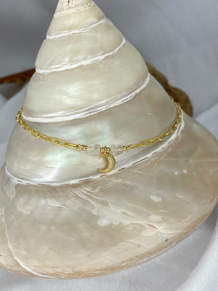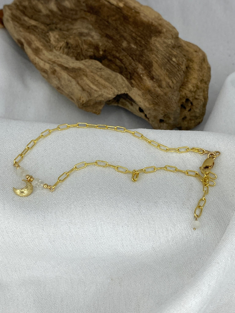 Beautiful handcrafted anklet made using 14 K gold filled chain, Moonstone gems & a gold plated moon charm in the centre.