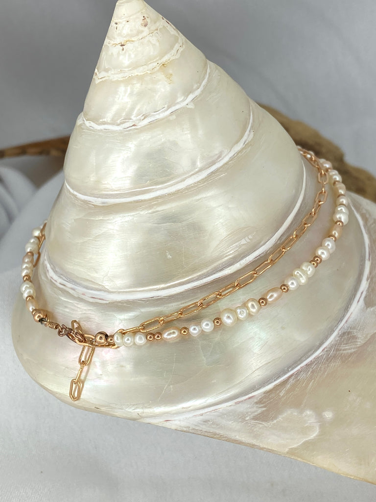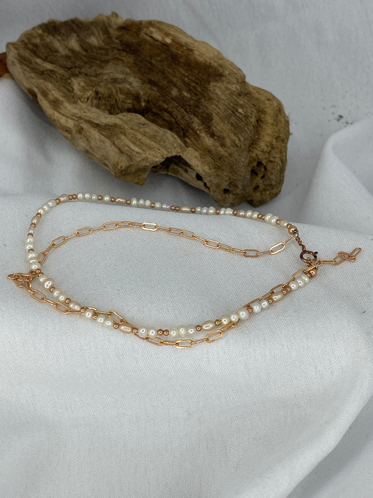 Beautiful double strand anklet featuring Freshwater Pearl on 1 strand and Rose Gold Paperclip chain on other strand.
