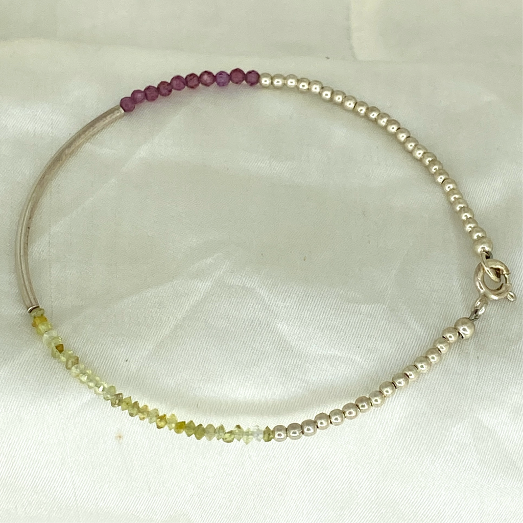 Garnet bracelet featuring 2 different Garnet stones, Grossular Garnet & Garnet on either side of a silver bar in the centre.