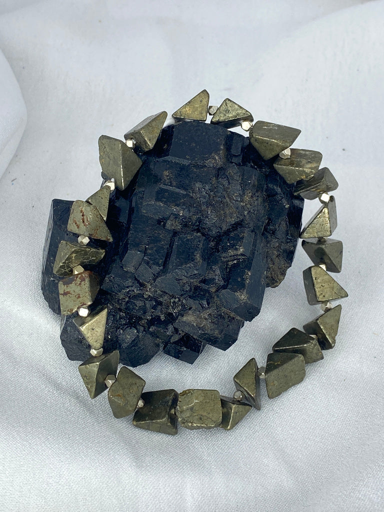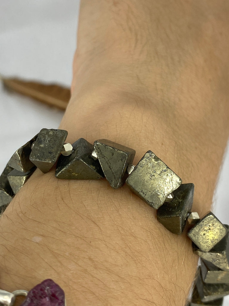 Large size stretchy bracelet made using triangular shaped Pyrite & Silver.