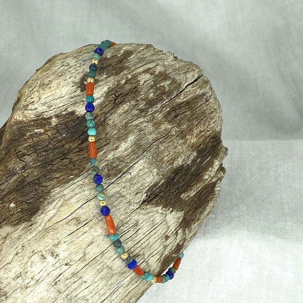 Stunning handmade bracelet featuring Red Coral, Turquoise, Lapis Lazuli & 14k gold filled.