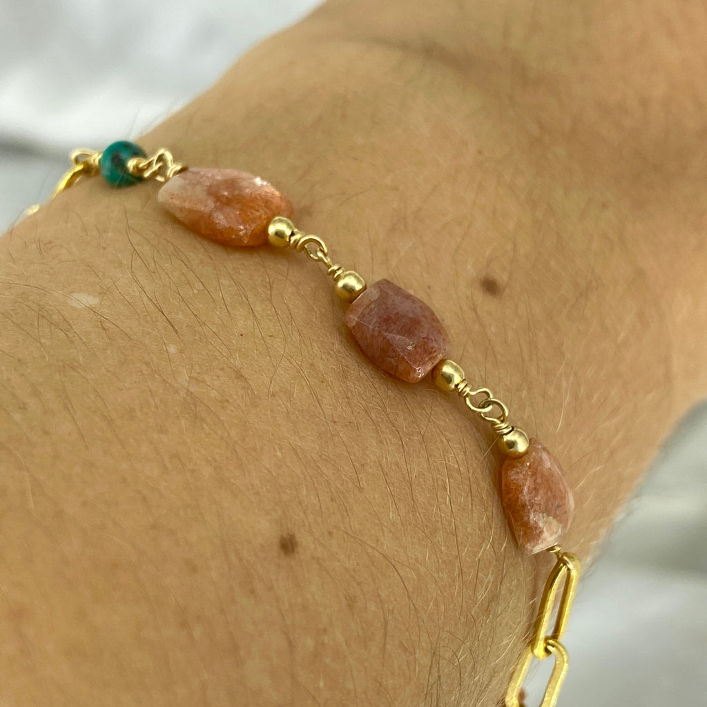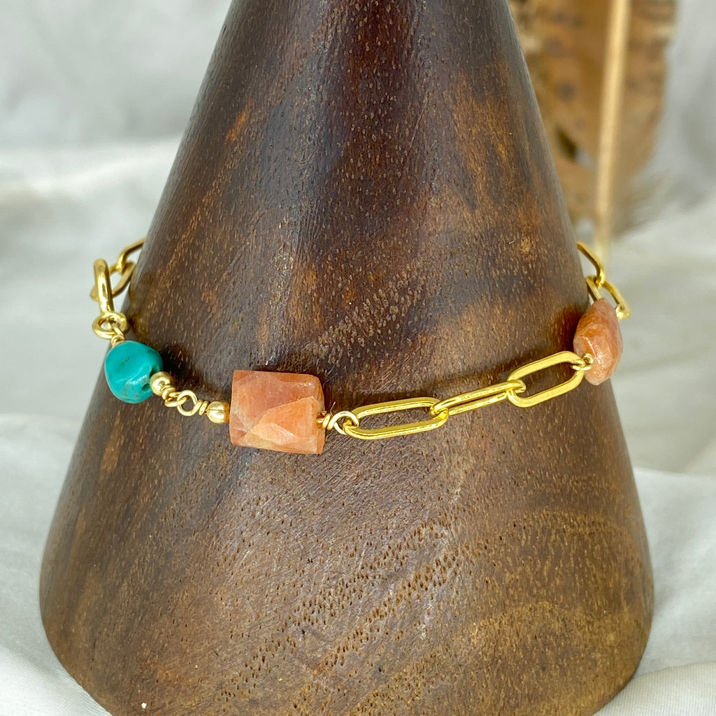 Uniquely handcrafted 14k gold filled bracelet featuring Sunstone & Turquoise on a Paperclip chain.