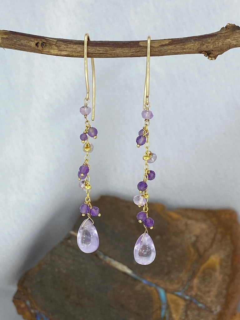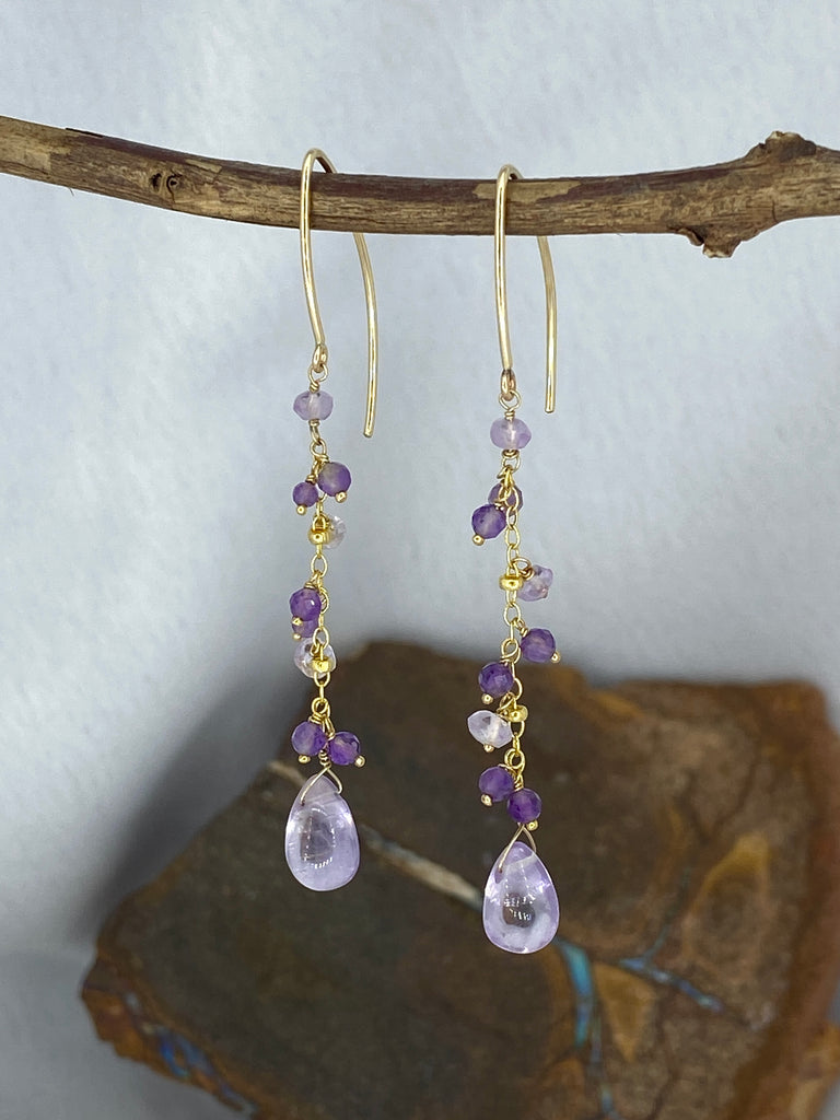 Elegant gold filled earrings with various Amethyst gemstones hanging from a gold filled shepherd hook.