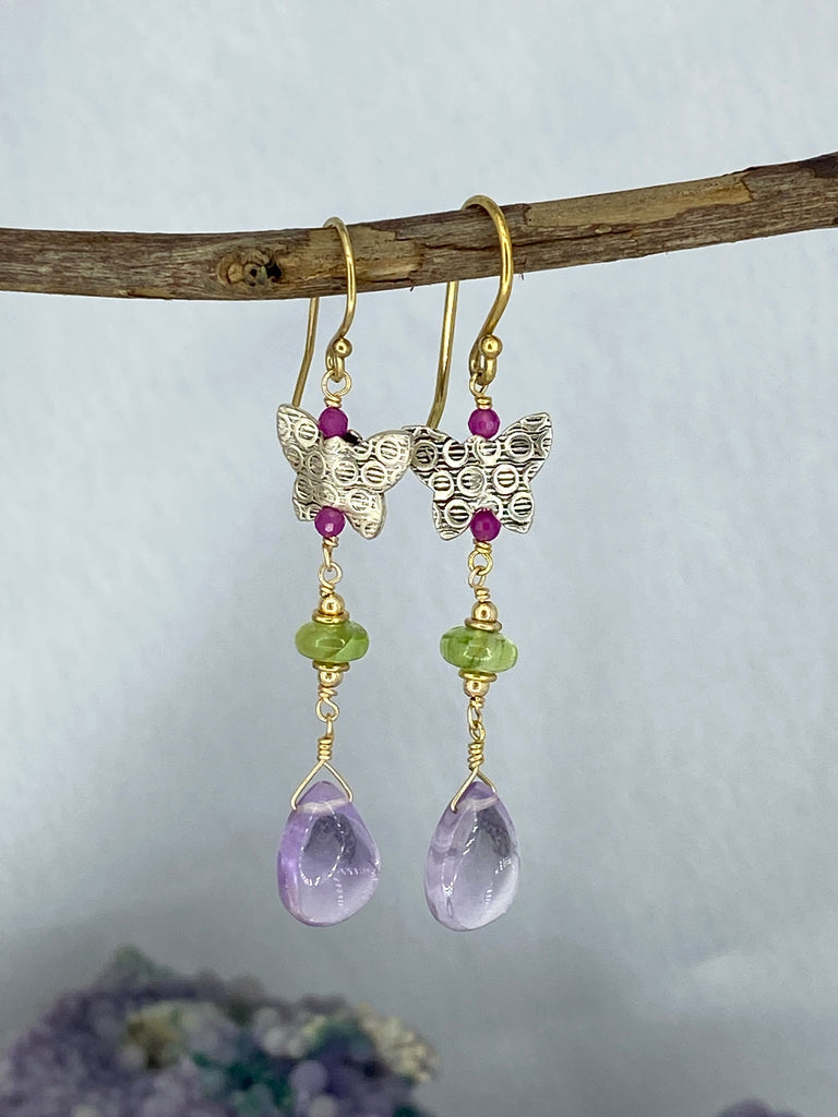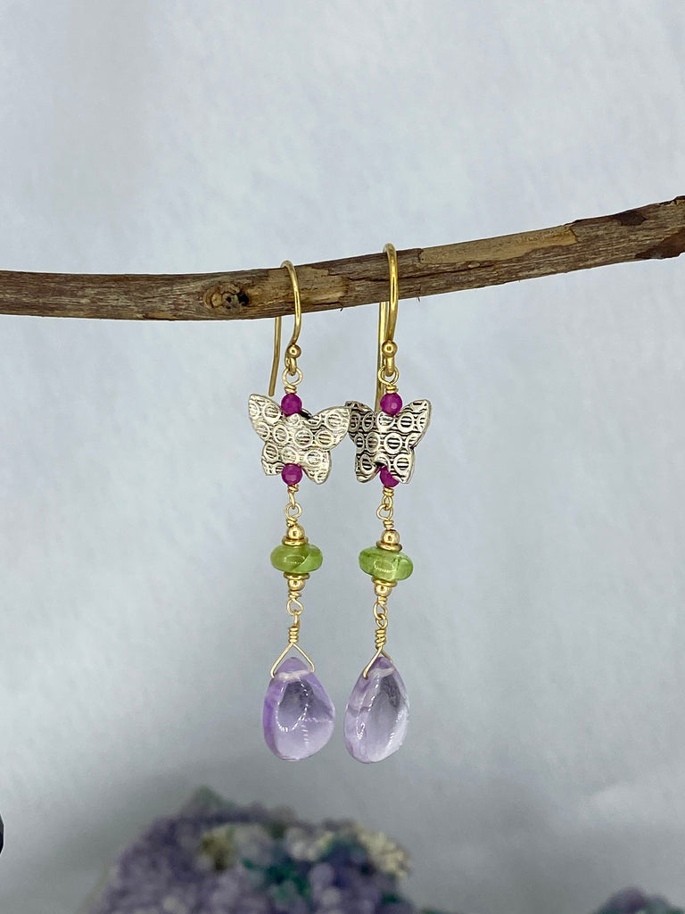 Beautiful handmade earrings featuring a Hill-tribe 920 silver butterfly in between 2 small Ruby crystals, Peridot beneath, followed by an Amethyst teardrop at the bottom.