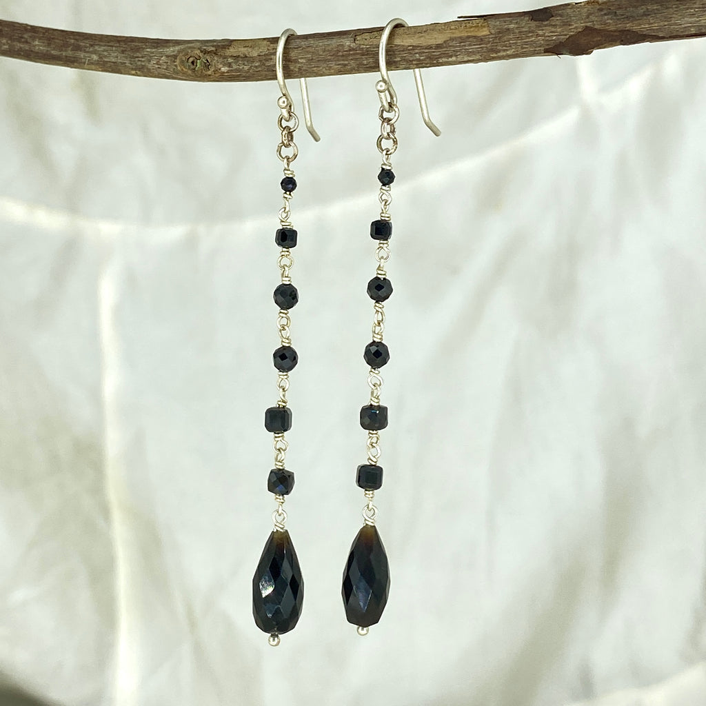 Handmade earrings made in-store featuring different facetted Black Onyx crystals with a teardrop hanging at the bottom.