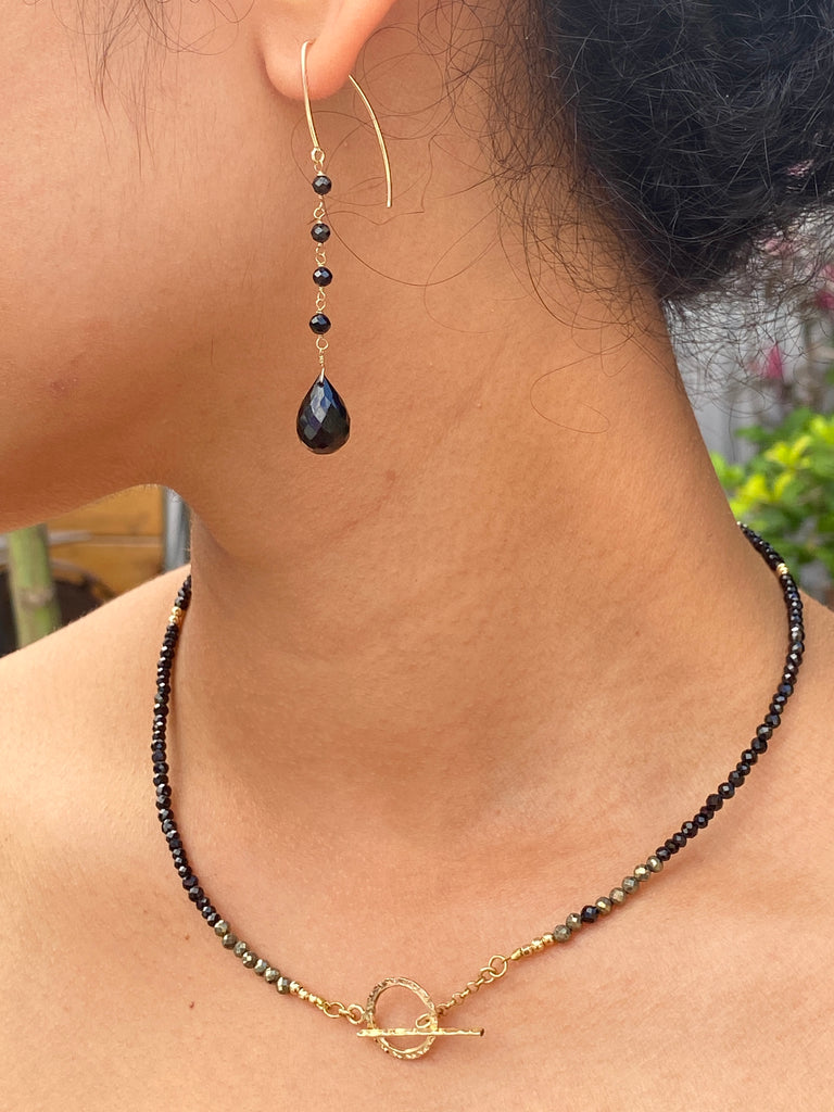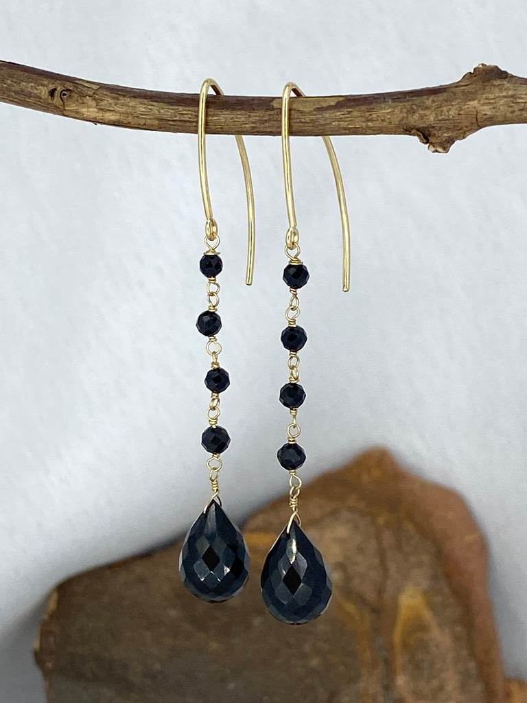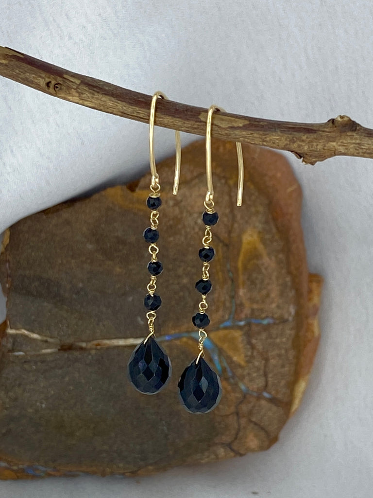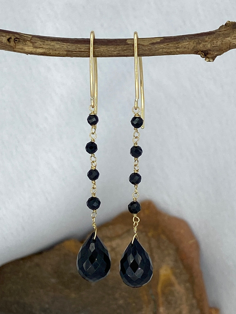 Elegant and stylish dangle earrings made to wear for a special event, party or everyday wear. Made with 14 k Gold Filled and featuring Black Spinel with a facetted Black Garnet at the bottom.