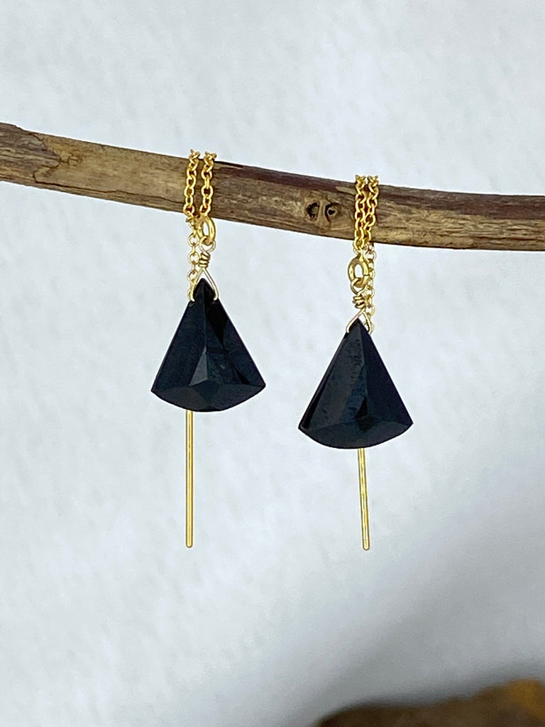 Elegant and stylish earrings on a gold filled thread through earring chain with a uniquely shaped Black Spinel gemstones hanging down.