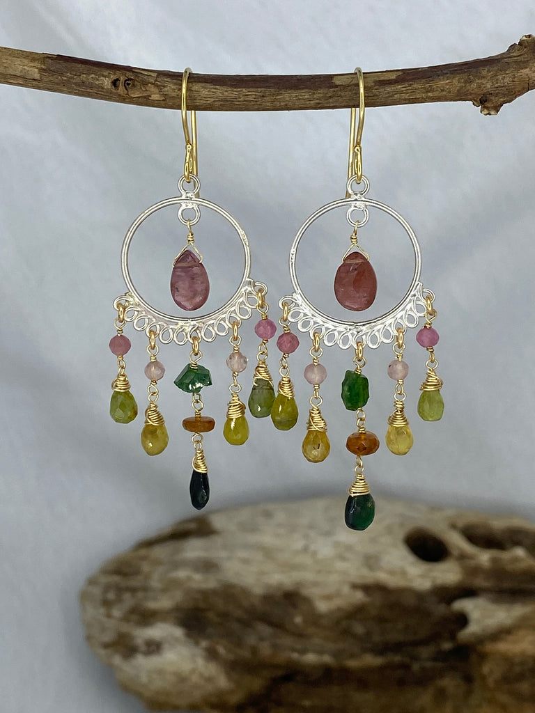 These earrings are handmade using a mixture of 14kgf and 925 sterling silver with Tourmaline gemstones in a variety of different colours & shapes hanging from a chandelier style hoop.