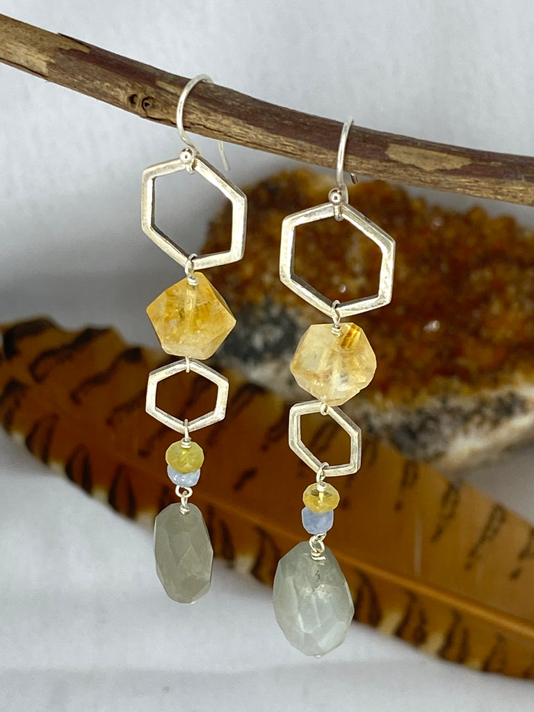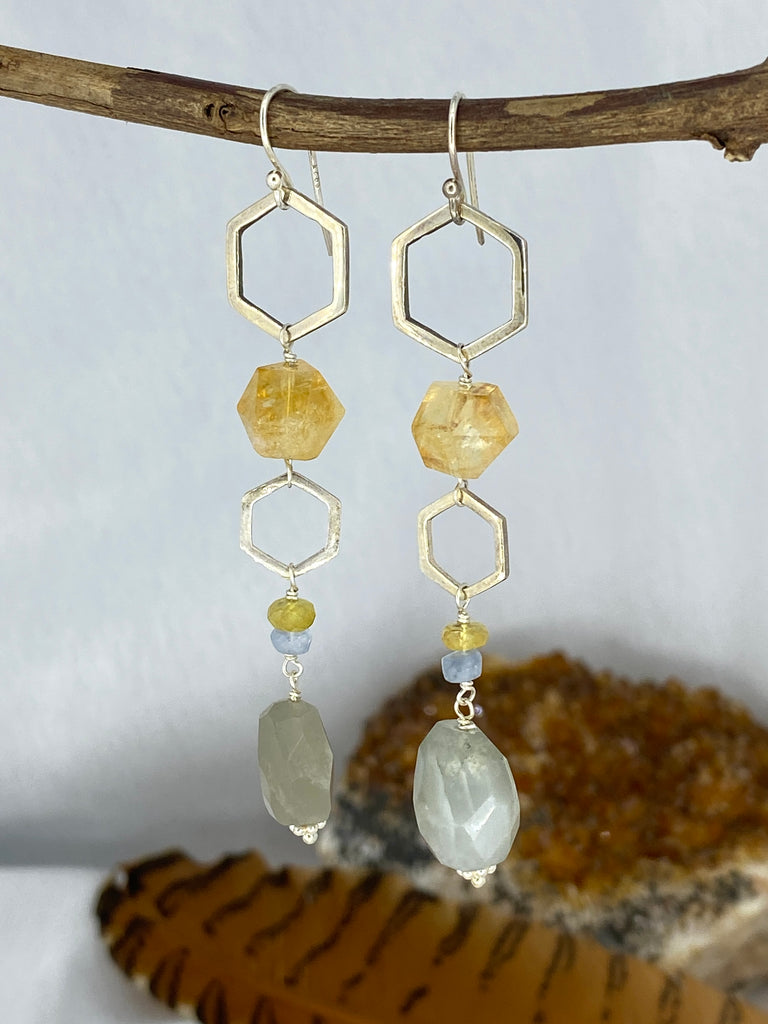 Unique and completely one of a kind earrings hand crafted using 925 sterling silver & a mixture of gemstone specimens including Hexagonal shape Citrine in between the 2 silver hexagons, Yellow Tourmaline, Sapphire & Grey Moonstone at the bottom.