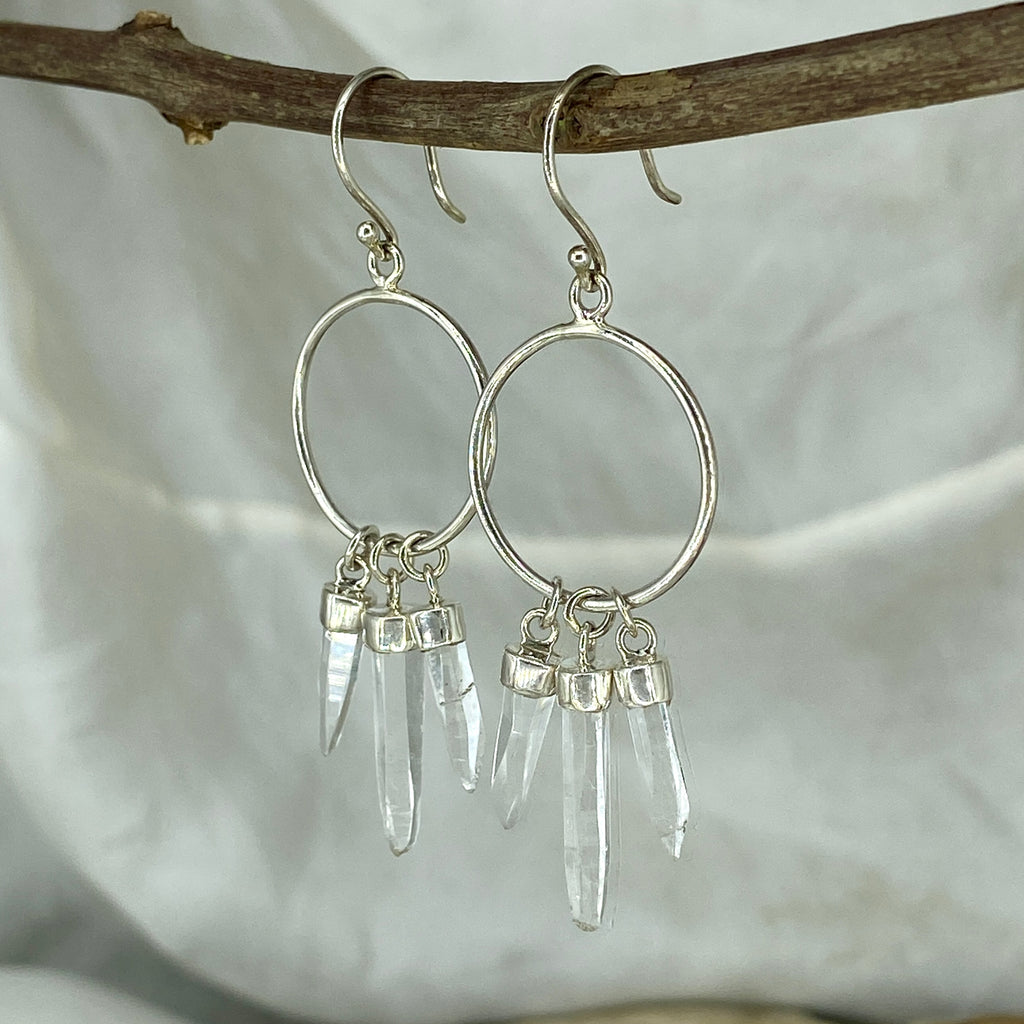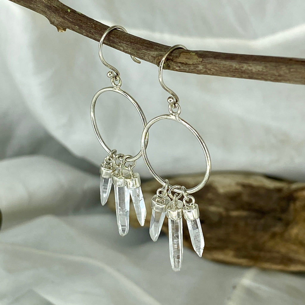 Beautiful unique sterling silver hoop earrings with 3 Clear Quartz points set in sterling silver.