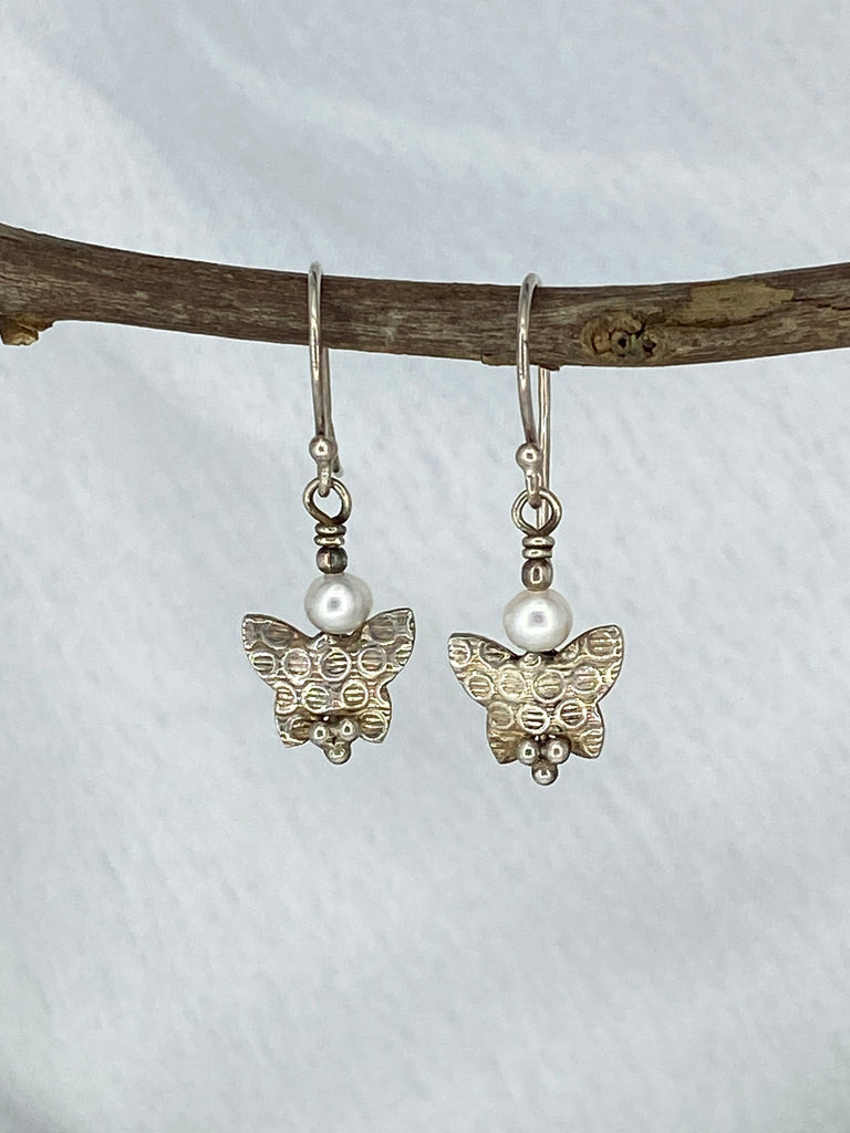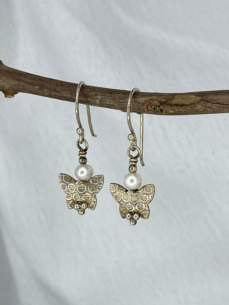 Handmade earrings featuring Fresh Water Pearl & Silver Butterfly.