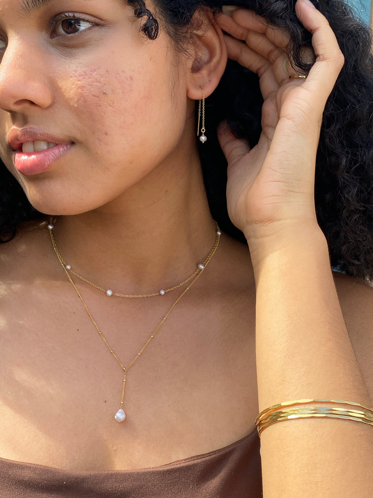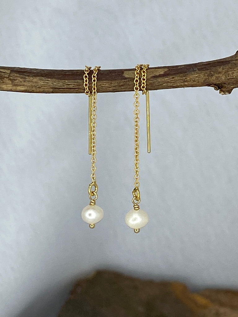 Stunning and Elegant thread earrings with a Freshwater Pearl hanging from a gold filled chain.