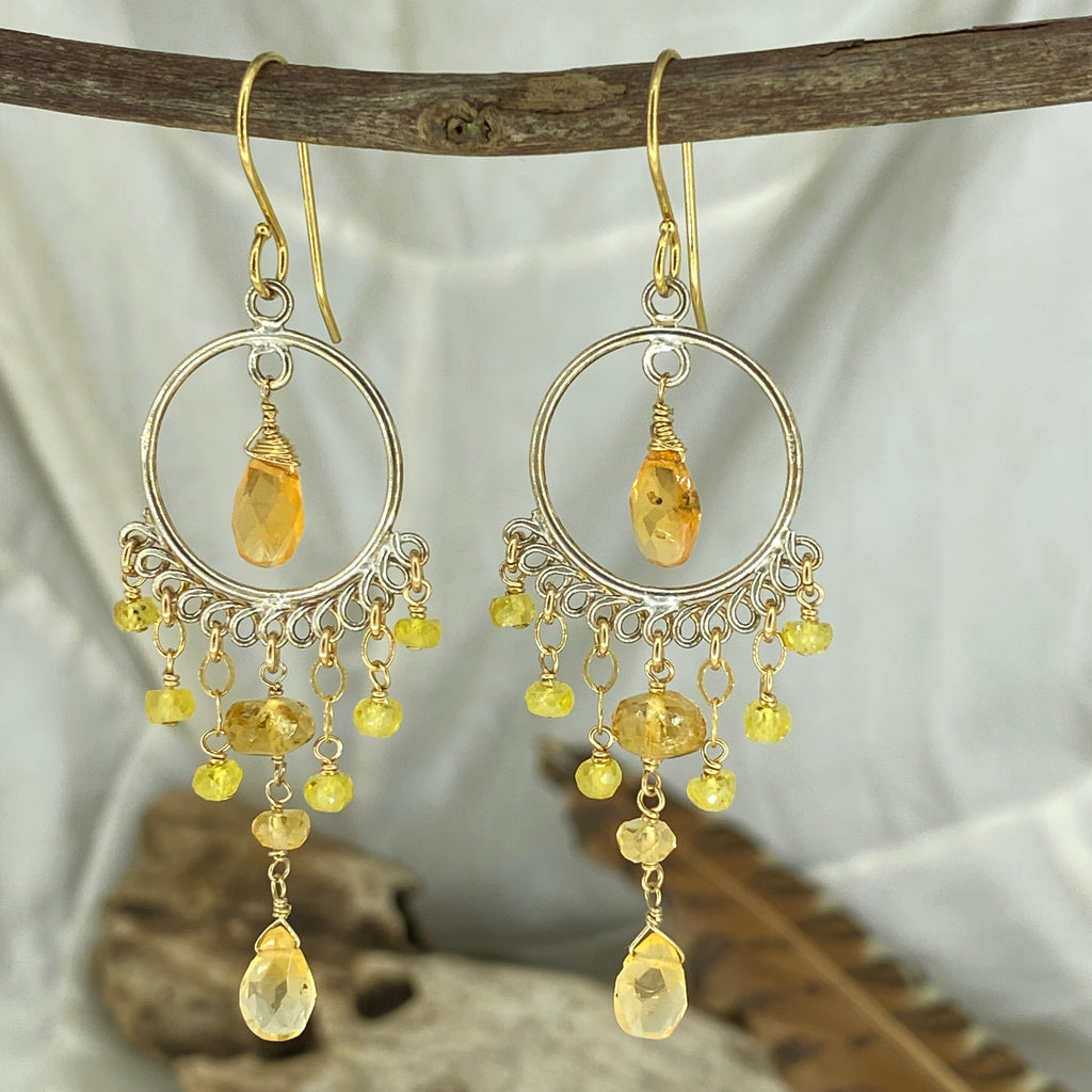 Beautifully handmade earrings made in store featuring Yellow Sapphire, Citrine & Fire Opal with mixed metals sterling silver and 14kgf.