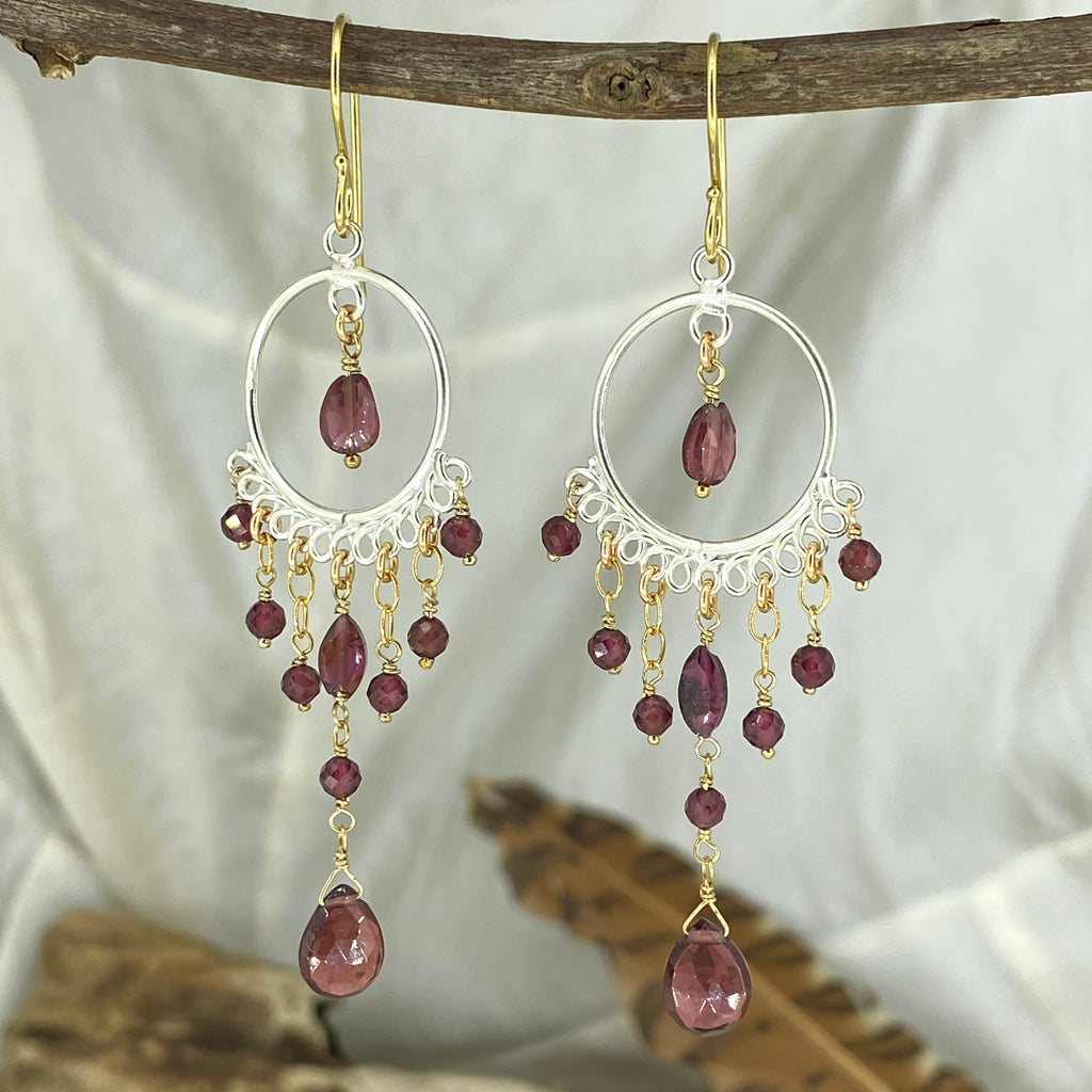 Beautifully handmade earrings made in store featuring a mixture of high quality Garnet gems hanging all throughout.