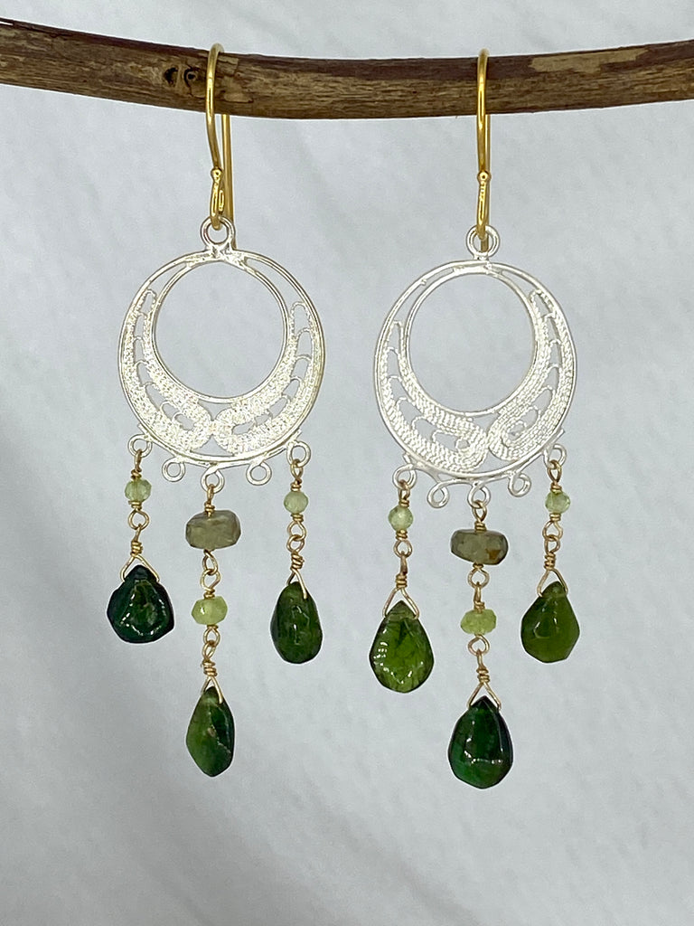 Beautiful mix of Green Tourmaline & Sapphire hanging from a silver decorative hoop with intricate design throughout.