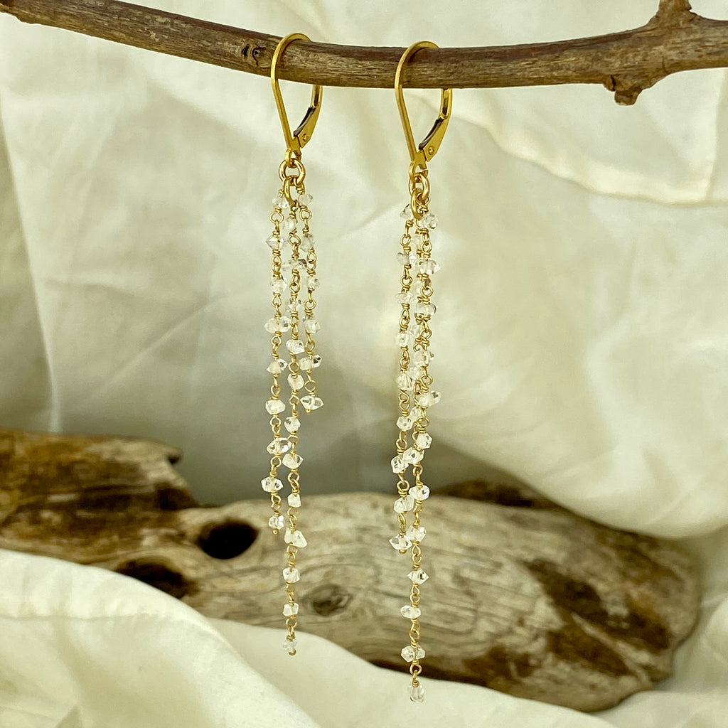 Shine bright and stand out in style with these Herkimer Diamond cascading 3 strand dangle Earrings. Hand made using 14K Gold Filled.