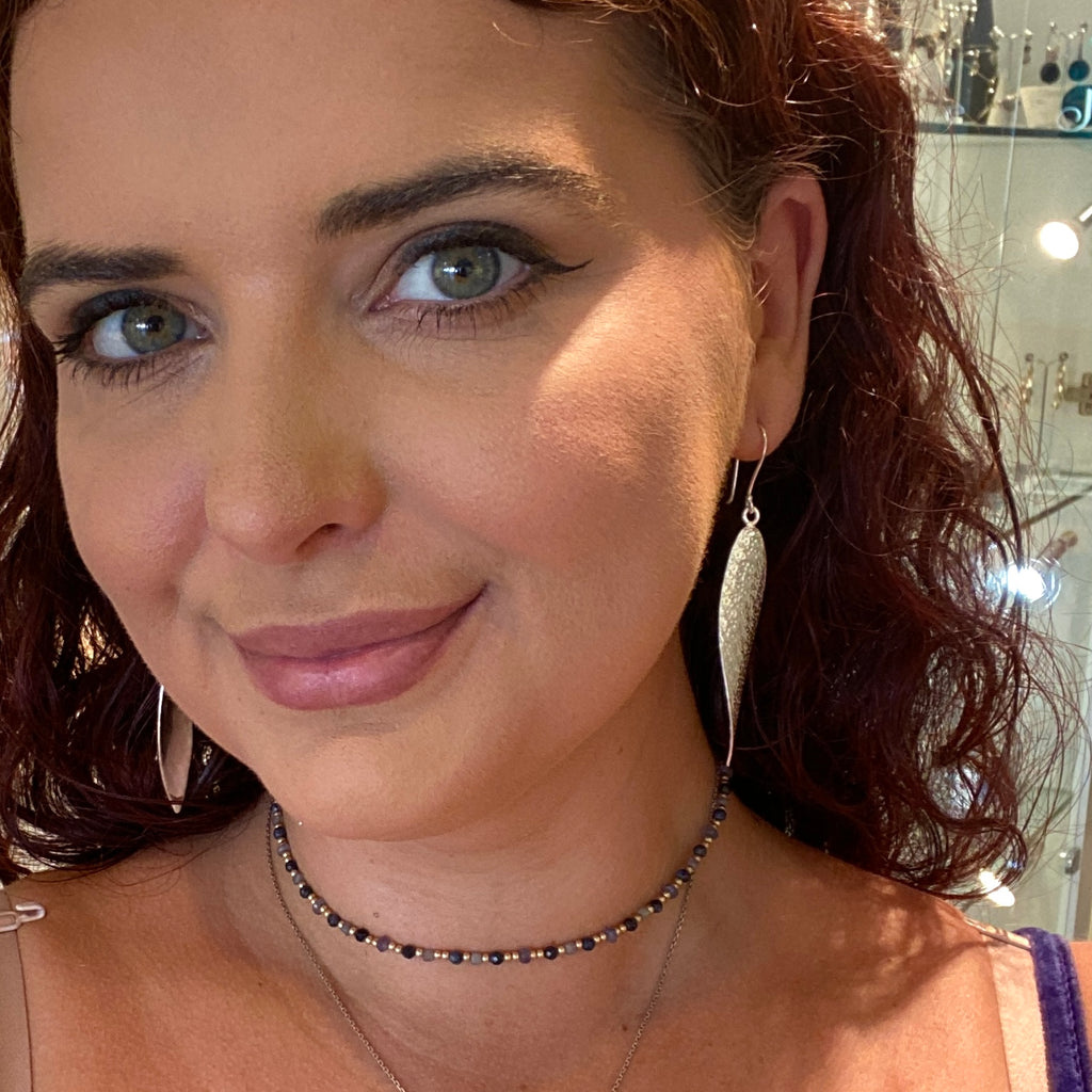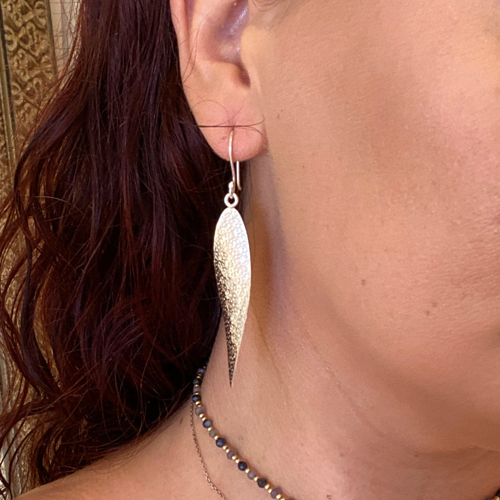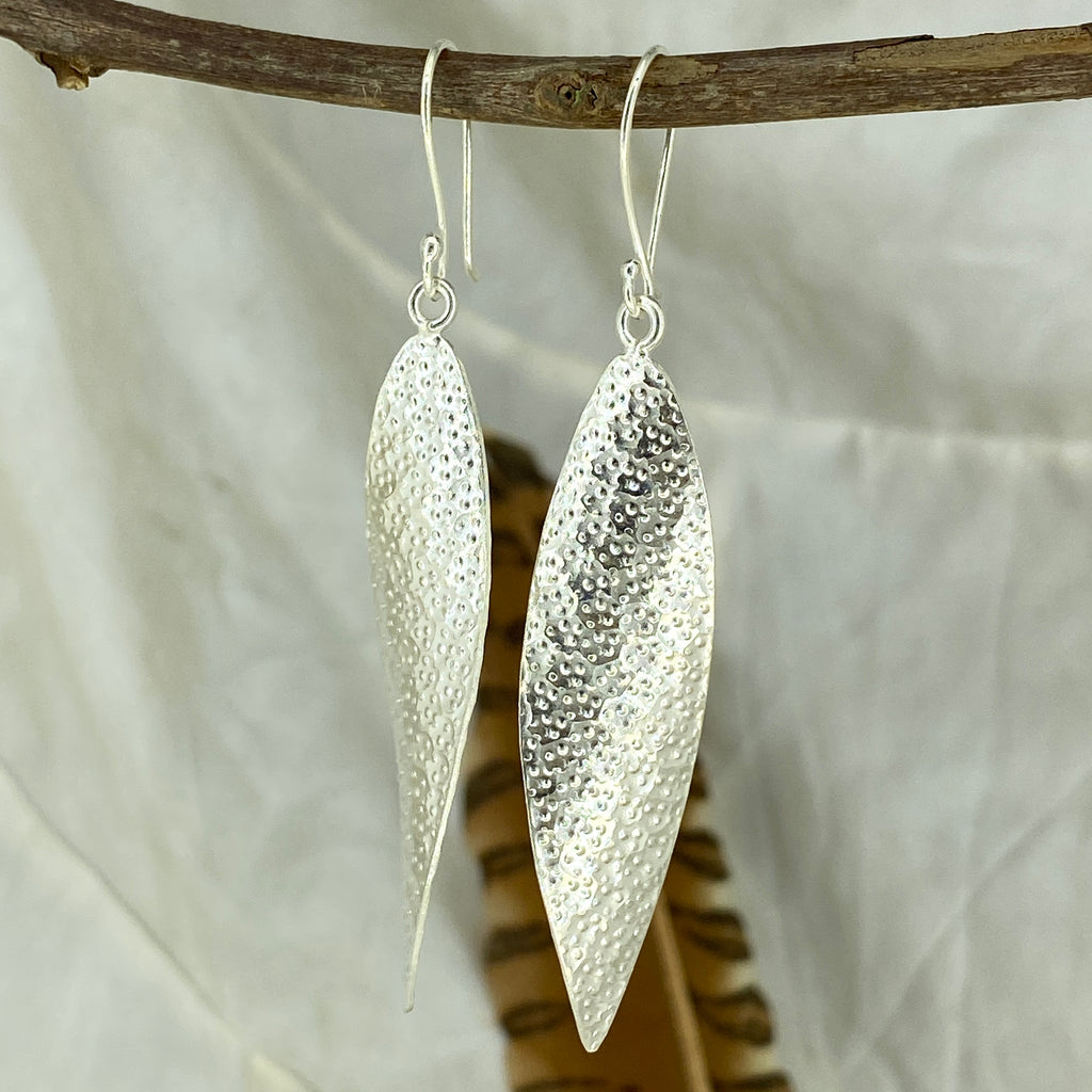 Hilltribe silver Earrings in a leaf shape with a softly beaten texture to finish.