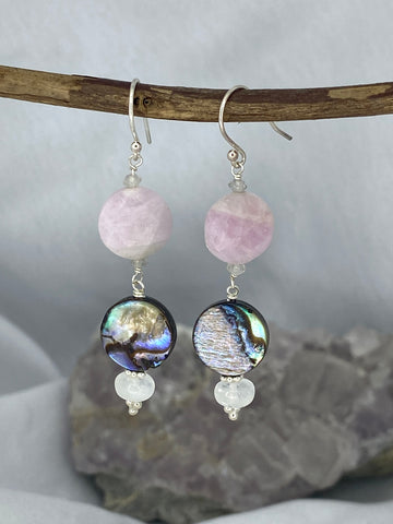 Stunning handmade earrings featuring an oval shape Kunzite, Paua shell and a Moonstone at the bottom.