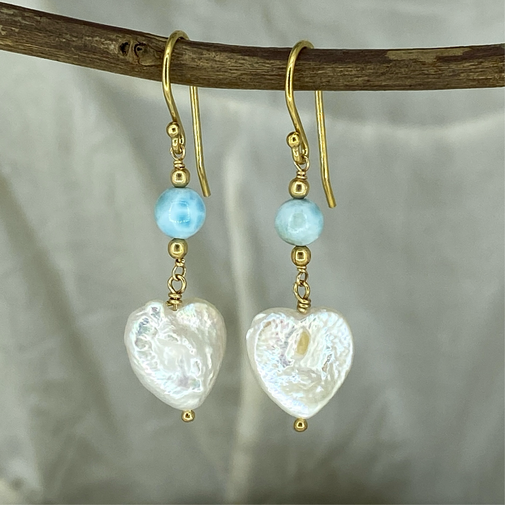 These one of a kind earrings are hand made in-store featuring Larimar & a unique Fresh water Pearl piece hanging at the bottom in the shape of a heart.