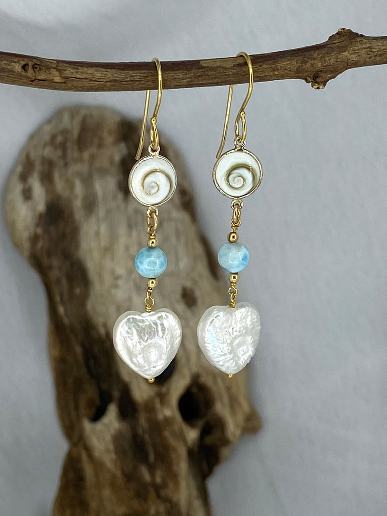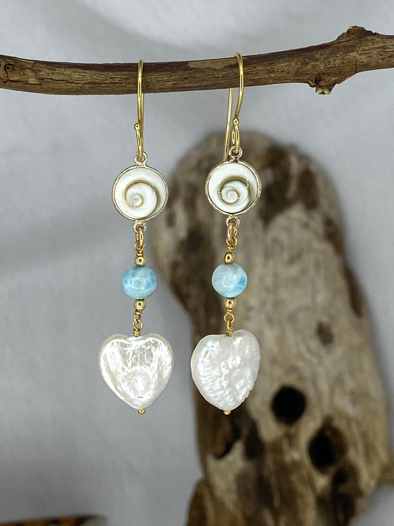 These stunning earrings can be worn on their own or with a matching necklace. They have a cats eye shell at the top, Larimar in the middle and a beautiful heart shaped Freshwater Pearl at the bottom.