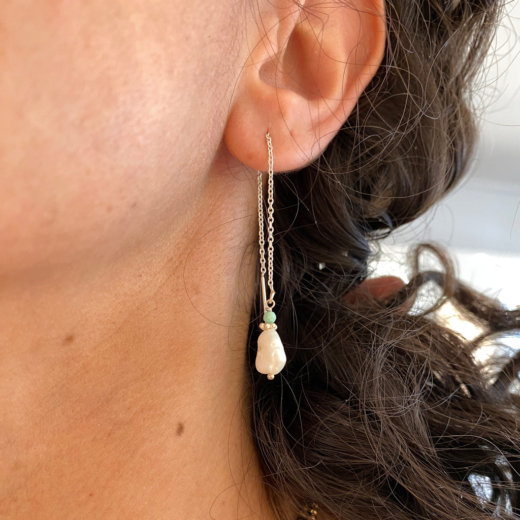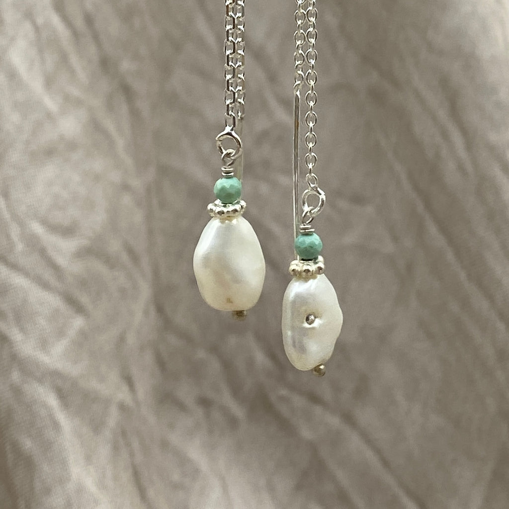Crafted with care, these earrings feature a serene Larimar gemstone and pearls, creating a harmonious design that adds a touch of grace and refinement to any ensemble.