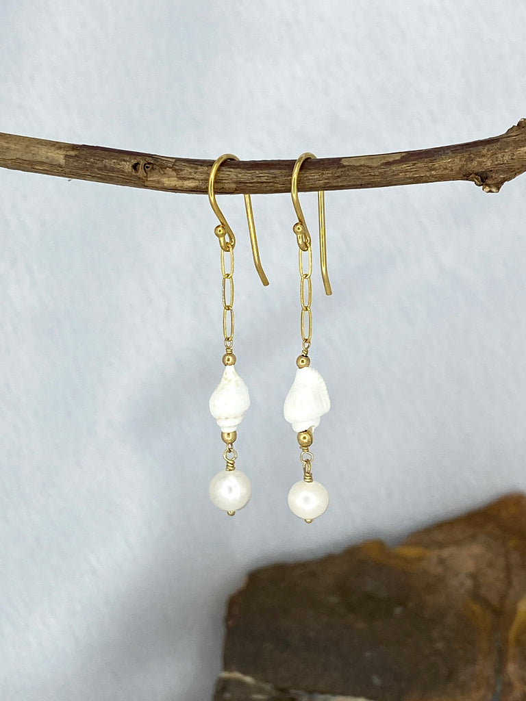 Stunning and Versatile earrings made with a shell and a Fresh water Pearl hanging from 14k gold filled Paperclip chain.