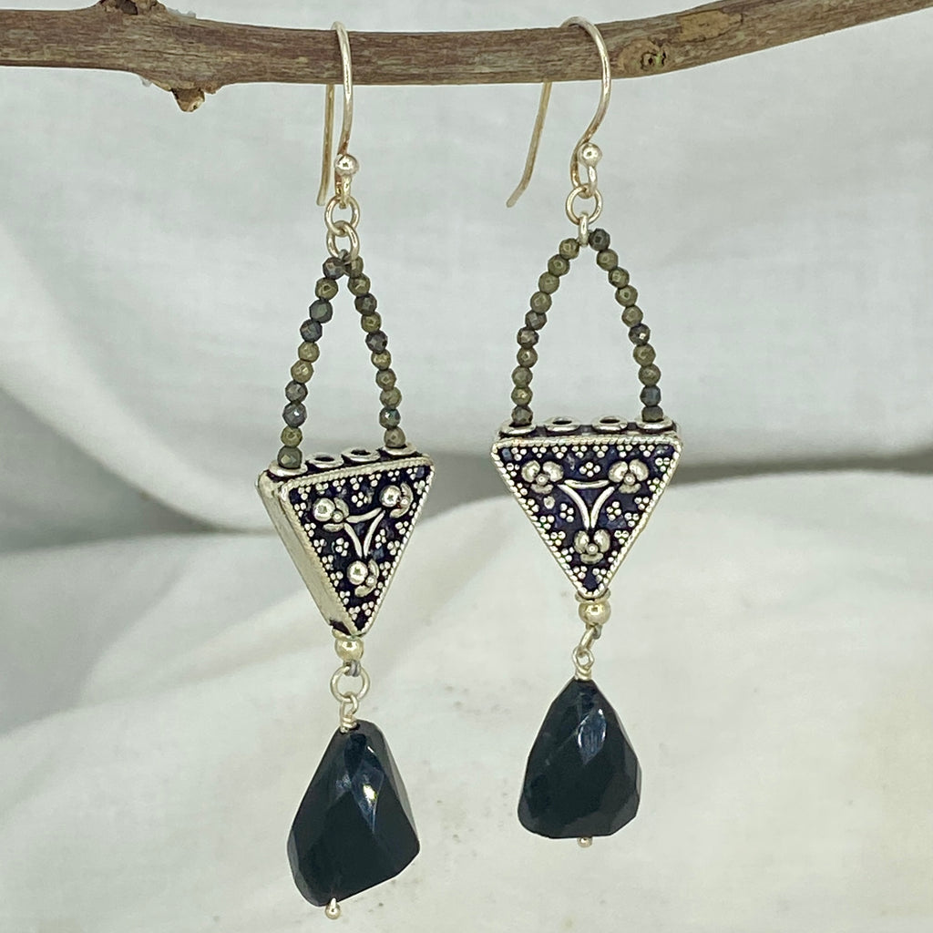 Beautiful earrings made with Pyrite and Black Onyx with decorative silver triangle.