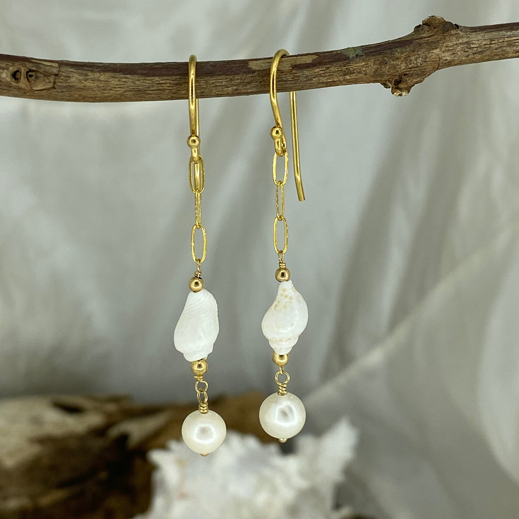 Stunning earrings made in-store using a Freshwater Pearl at the bottom and a shell both hanging of a 14kgf chain.