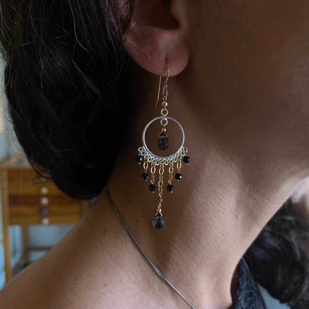 Spinel, Tourmalinated Quartz & Pyrite Earrings Mixed Metal