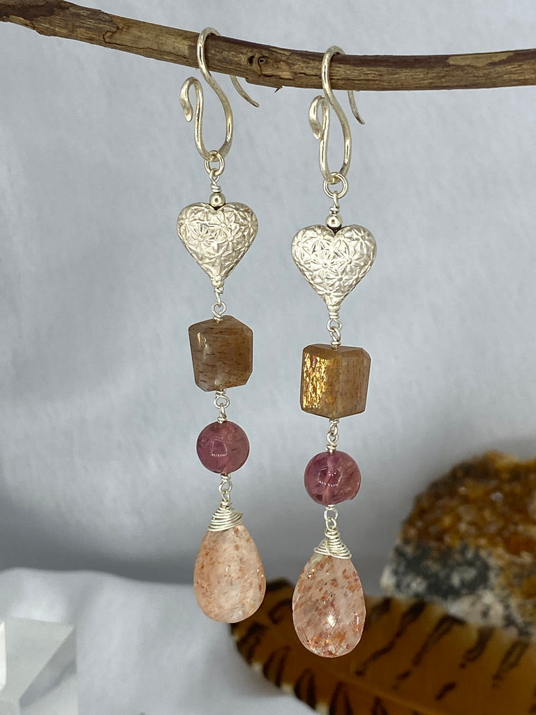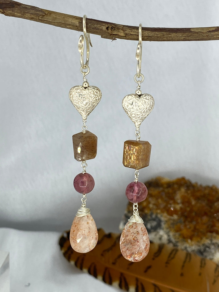 Beautiful & completely unique earrings hand crafted & carefully created with a teardrop Sunstone hanging at the bottom, Pink Moonstone sphere & a Tourmaline just below a silver heart.