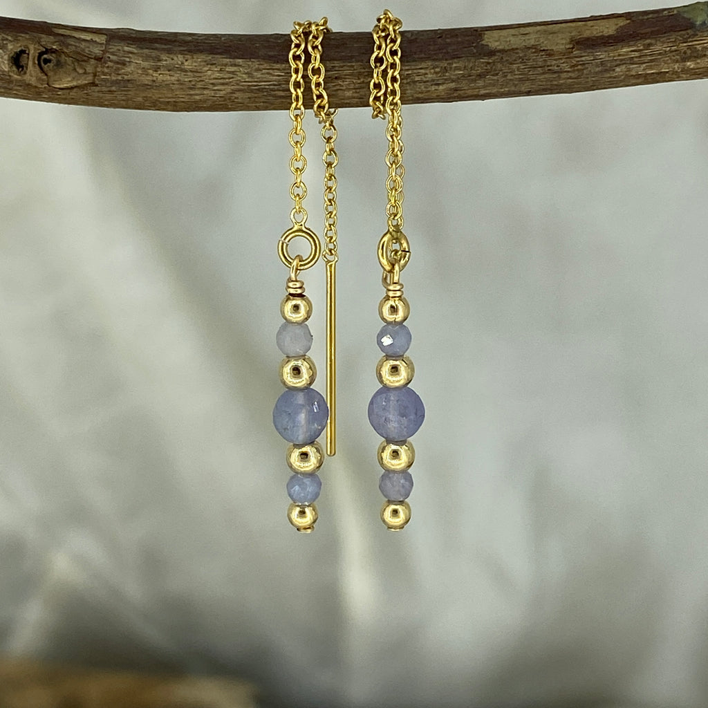 These stunning thread through earrings have been carefully handcrafted in-store featuring high quality Tanzanite crystals & 14kgf beads.