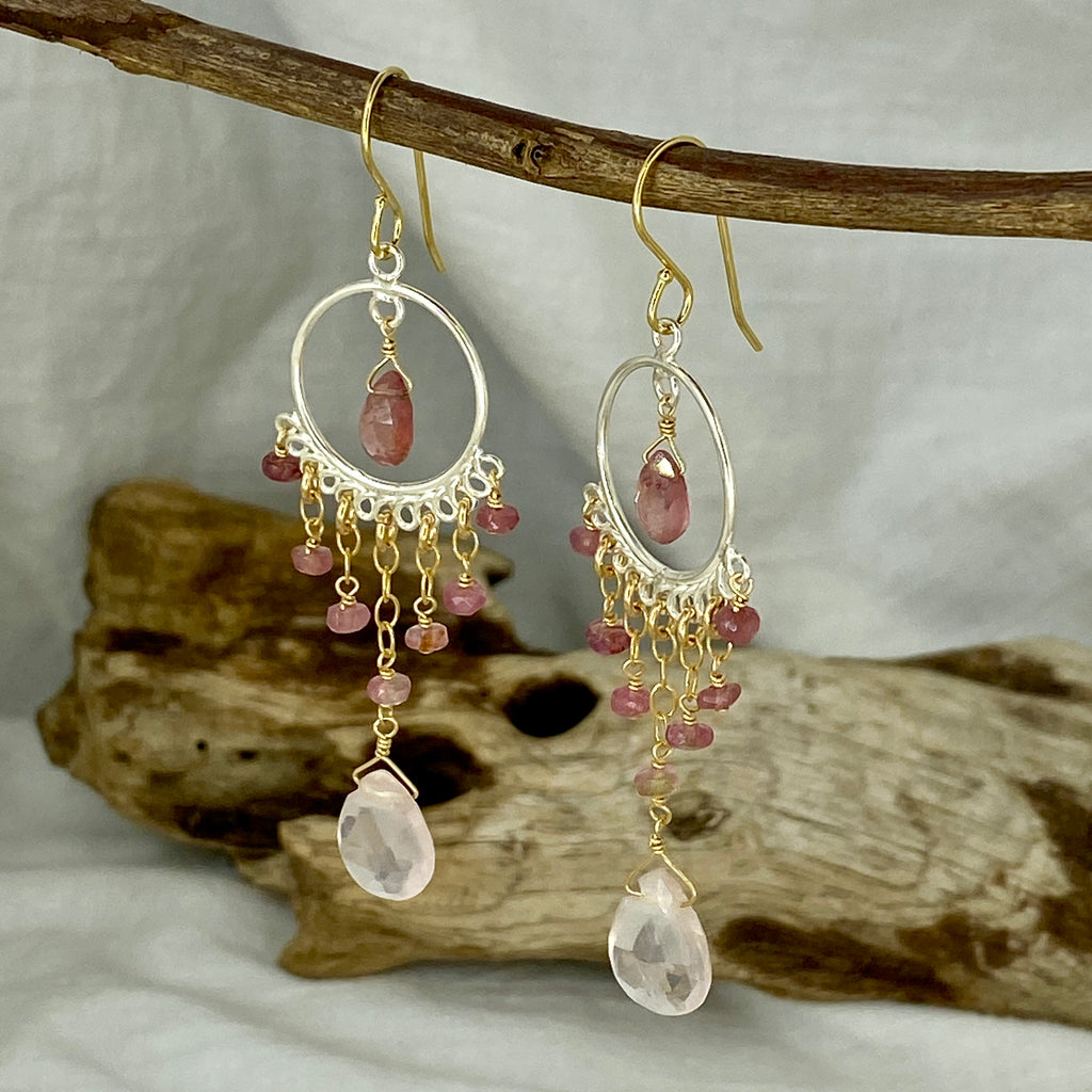 Stunning chandelier style handmade earrings with a mix of Tourmaline and Rose Quartz gems.