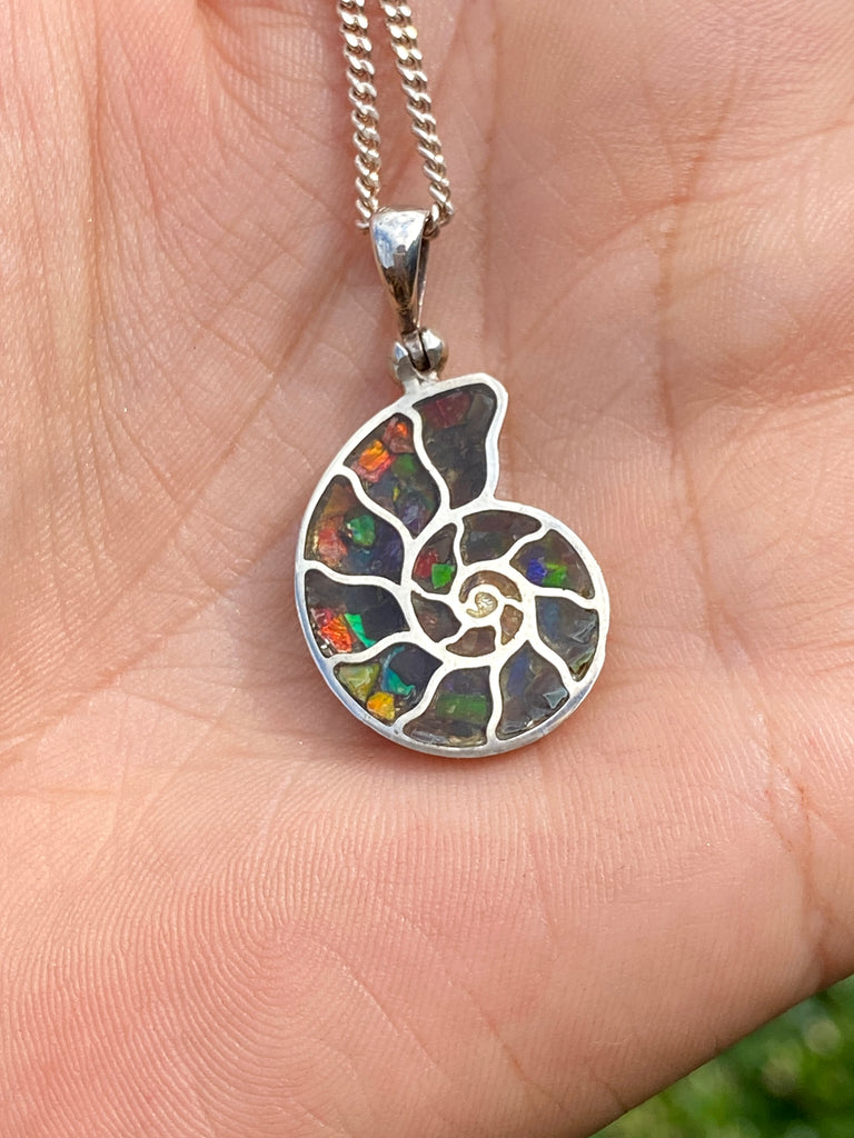 Beautiful flashes of colour shining through in this Ammolite Inlay pendant made with 925 sterling silver.