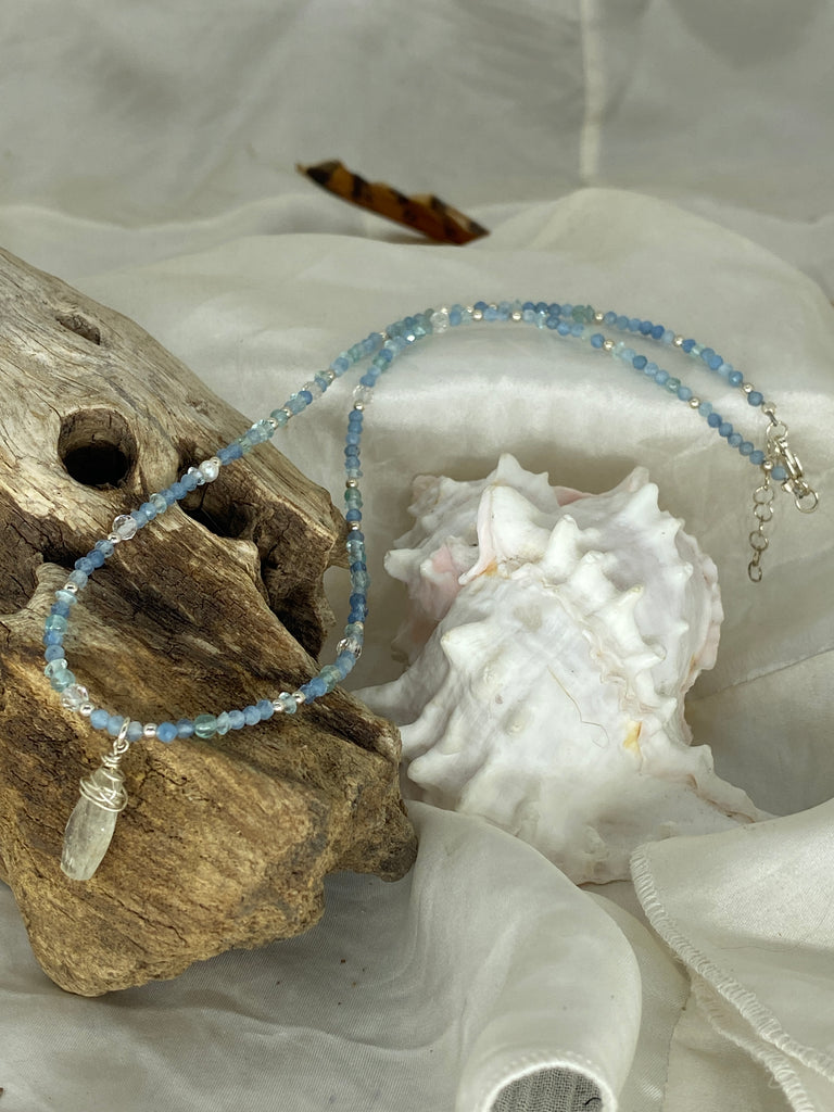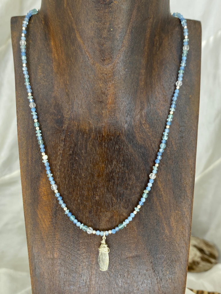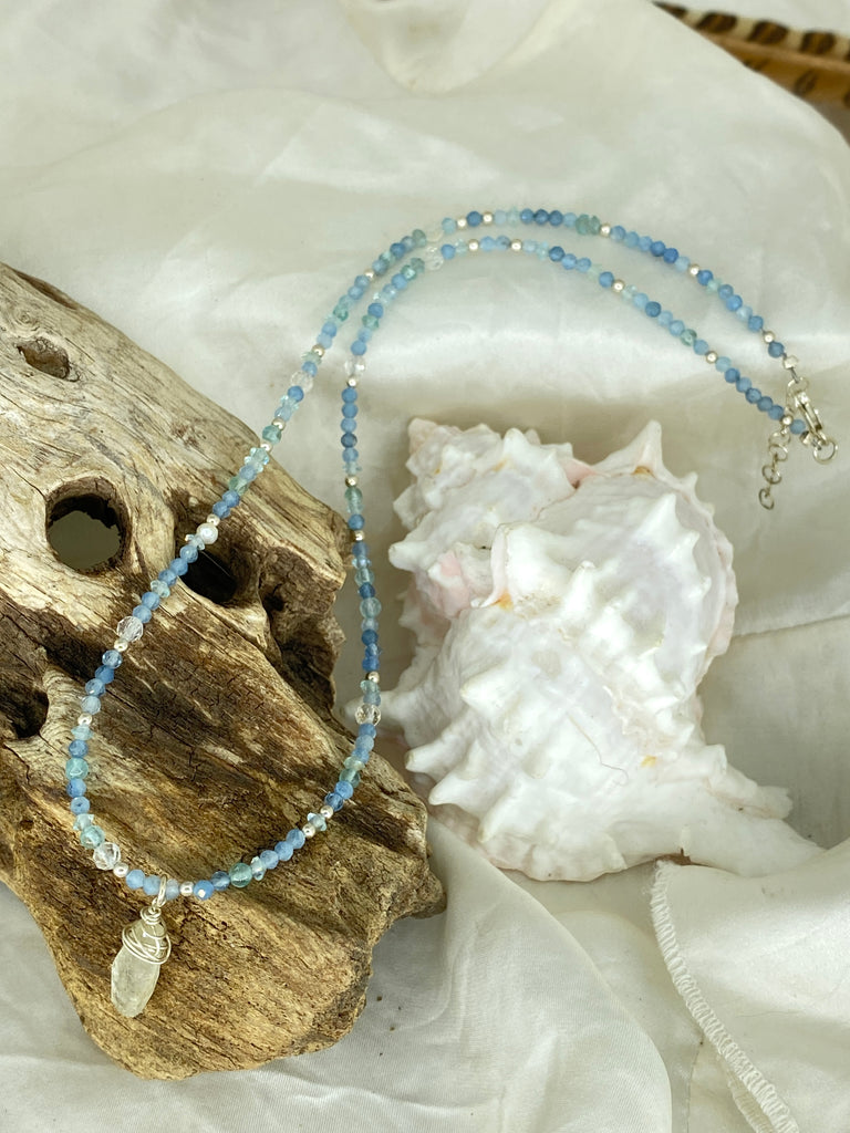 Beautifully hand crafted necklace featuring a Clear Quartz Point hanging off a beaded gemstone necklace featuring Aquamarine, Apatite & White Topaz.