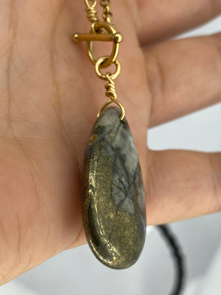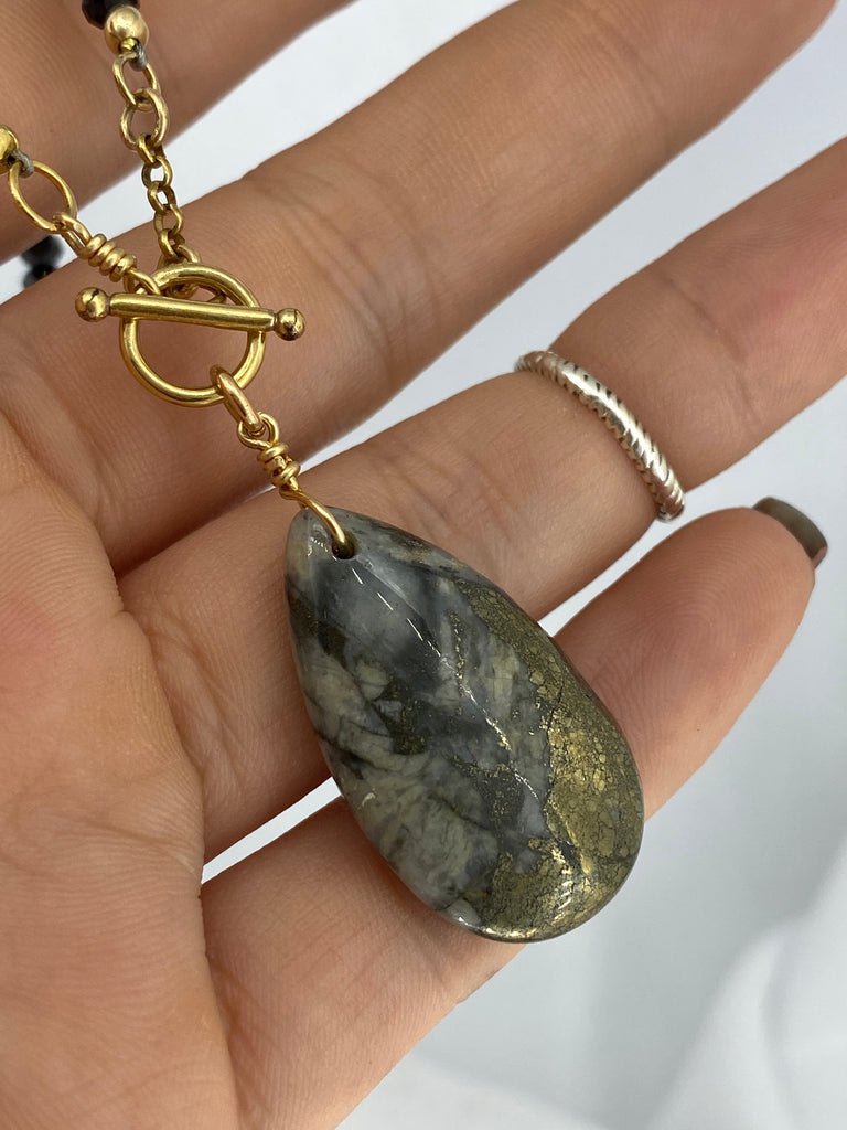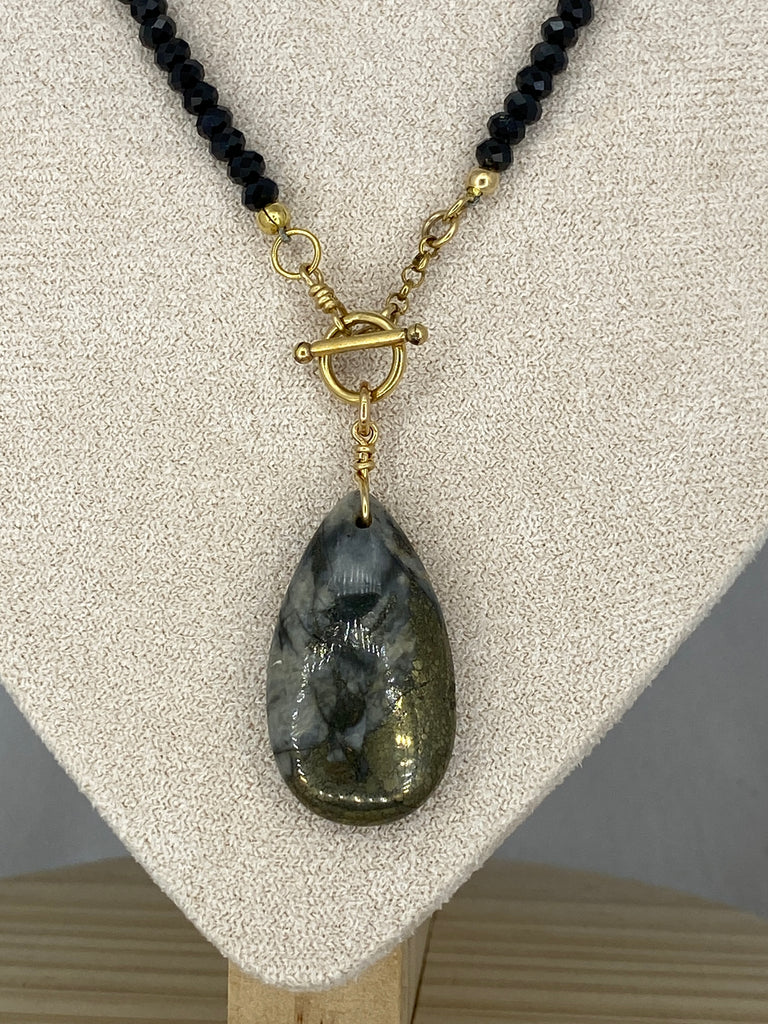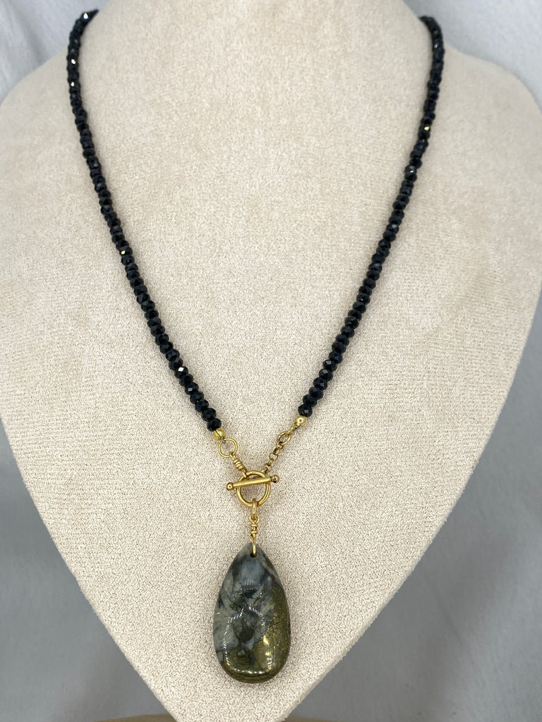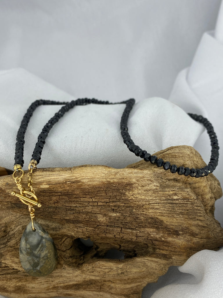 This is a stunning stand out necklace featuring Black Spinel gem beads & has a beautiful Pyrite matrix hanging from the centre.