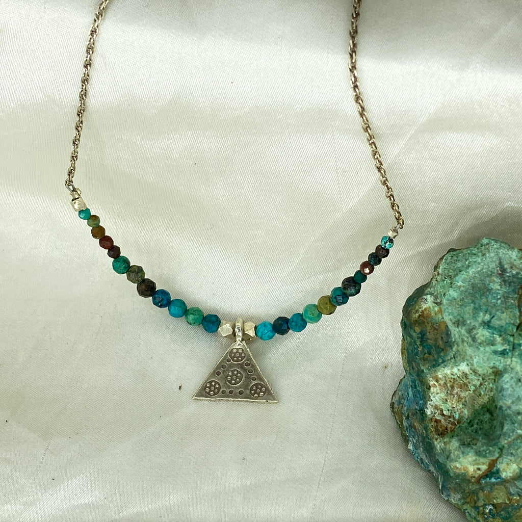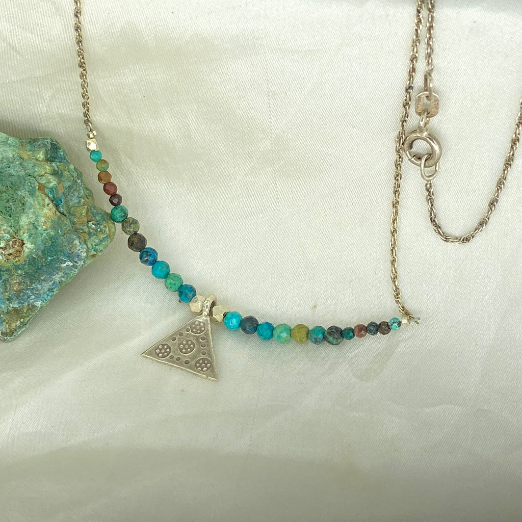 Stunning necklace featuring Chrysocolla gemstone section with embellishments attached to a silver chain.