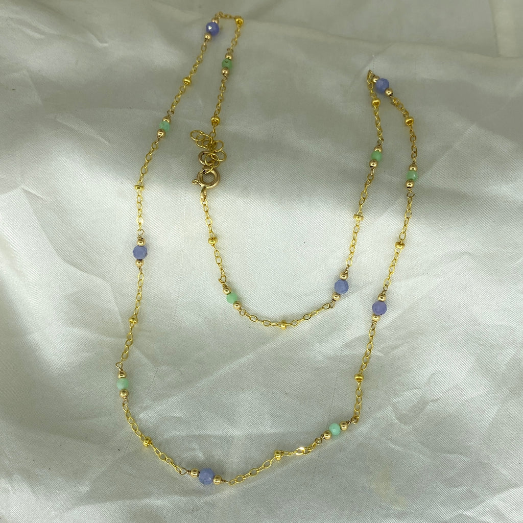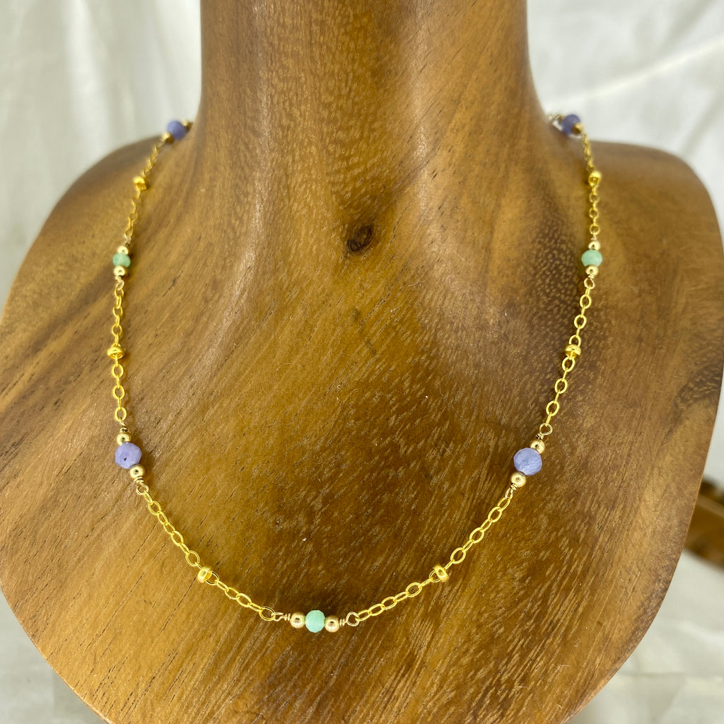 A beautiful handcrafted necklace with Tanzanite & Chrysoprase on a 14kgf chain.