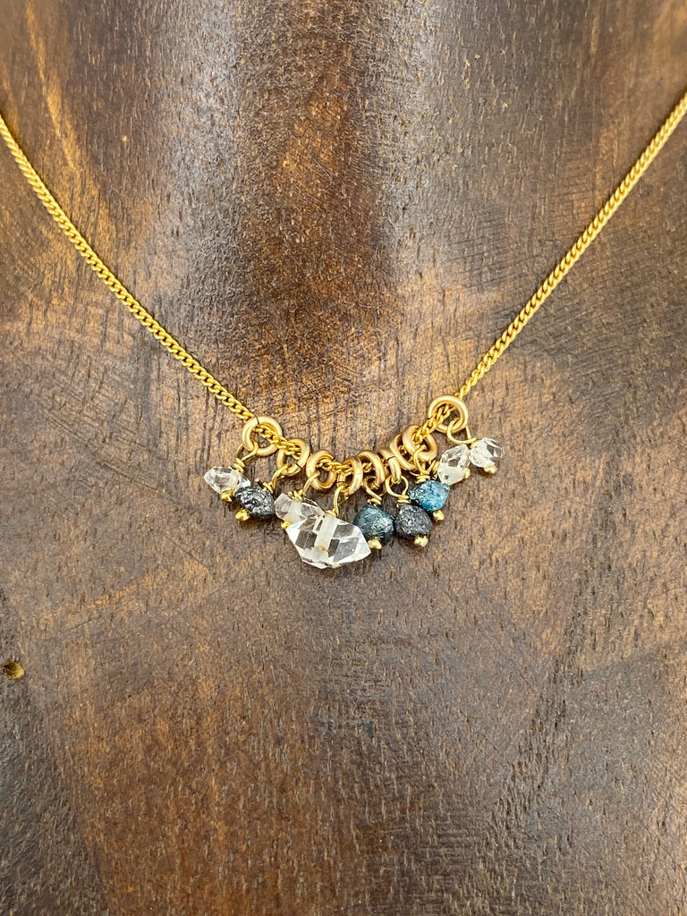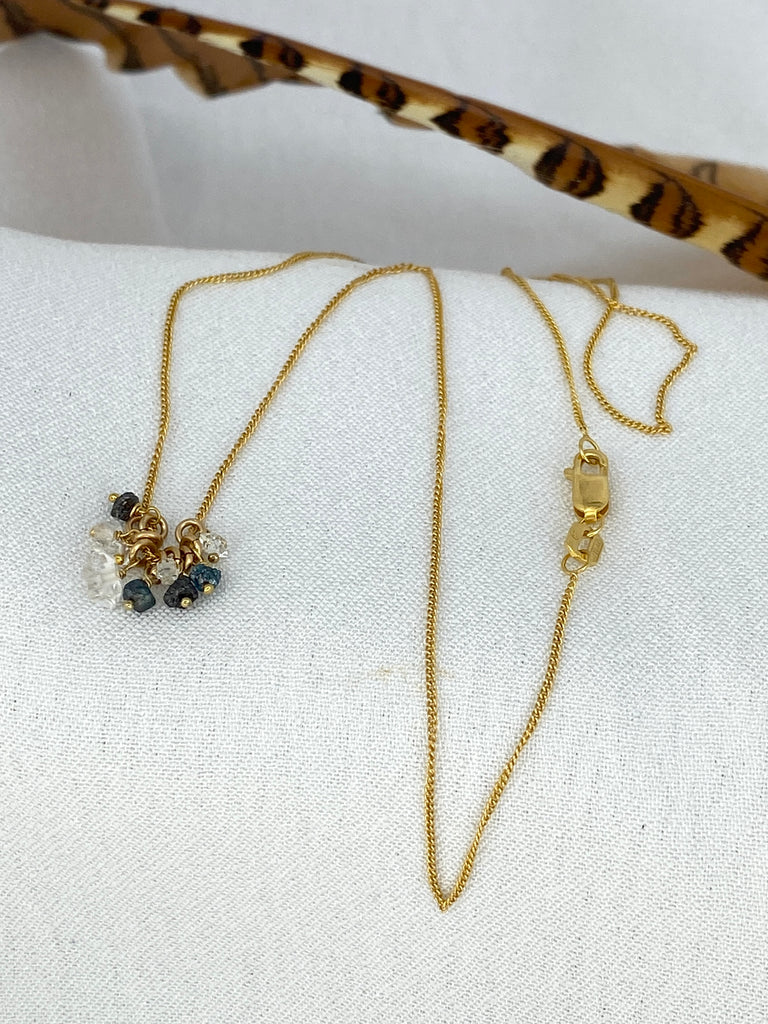 This necklace features 3 multiple diamonds hanging from a 14kgf chain. Diamonds consist of - 5 Herkimer diamond, 2 Black Diamond & 2 Blue Diamond.