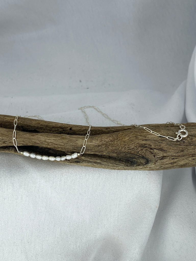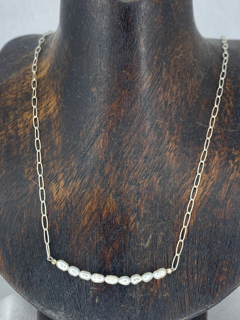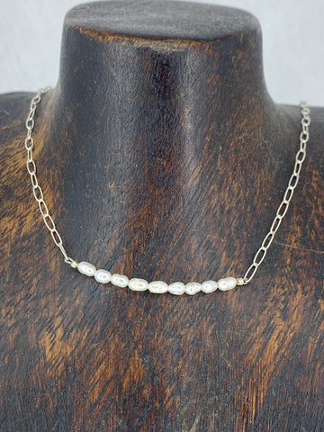 Handmade Necklace featuring a centre piece of Freshwater Pearl on a silver Paperclip chain.