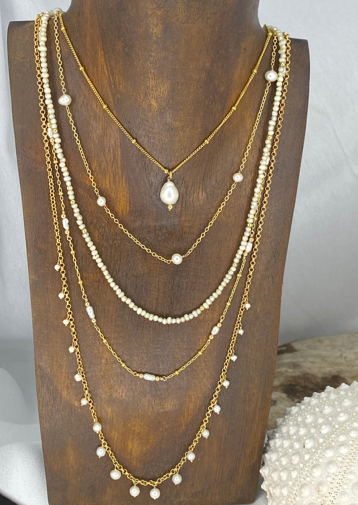 This beautifully hand-crafted necklace features Freshwater pearls hanging off a 14kgf chain.