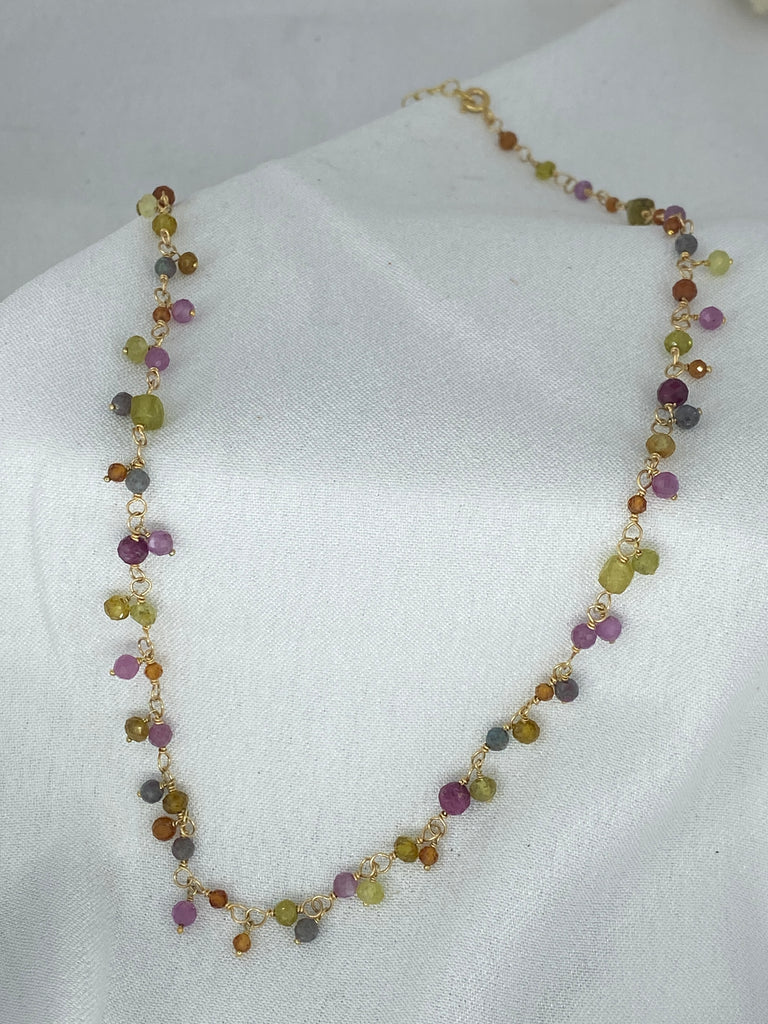 This stunning mix of Grossular Garnet, Hessonite Garnet, Ruby & Sapphire is handmade in-store using 14kgf. A very intricate design & metalwork to create this colourful masterpiece to adorn you.