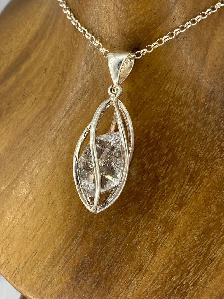 Beautiful pendant with a rough natural Herkimer Diamond in the middle of a sterling silver cage.