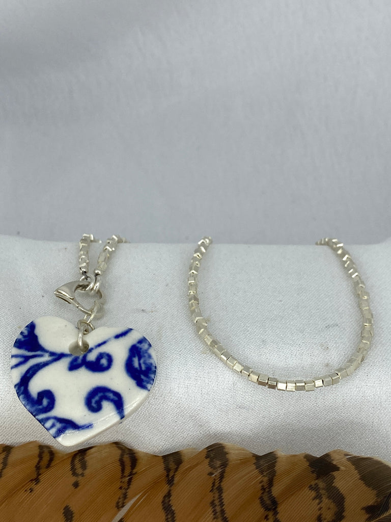 Handmade with care using cube Hilltribe silver beads & 925 sterling silver with a Handmade ceramic heart charm that can be worn with or without. Silver heart clasp to close at centre.