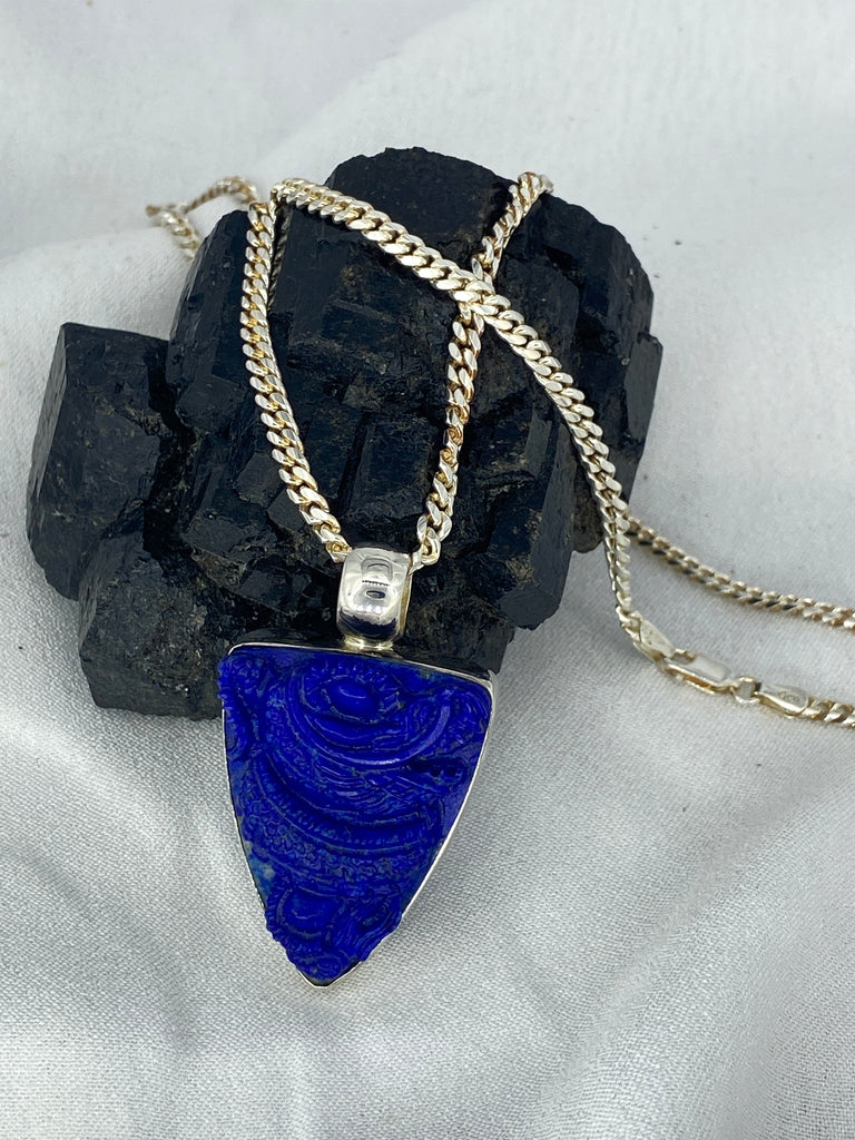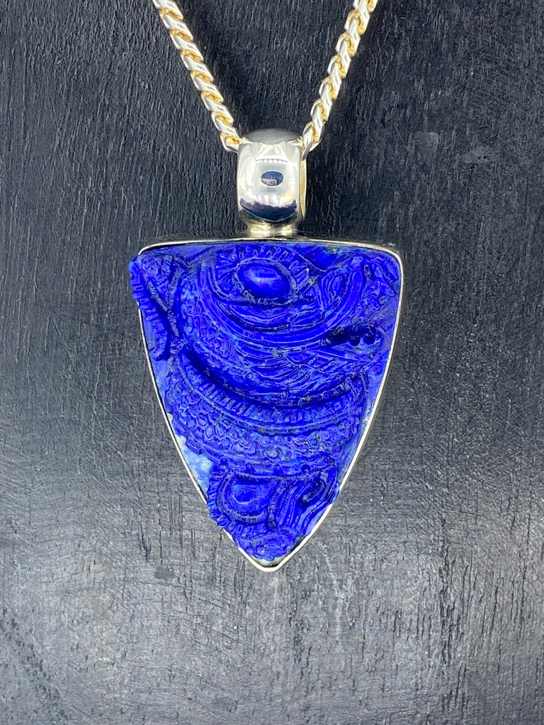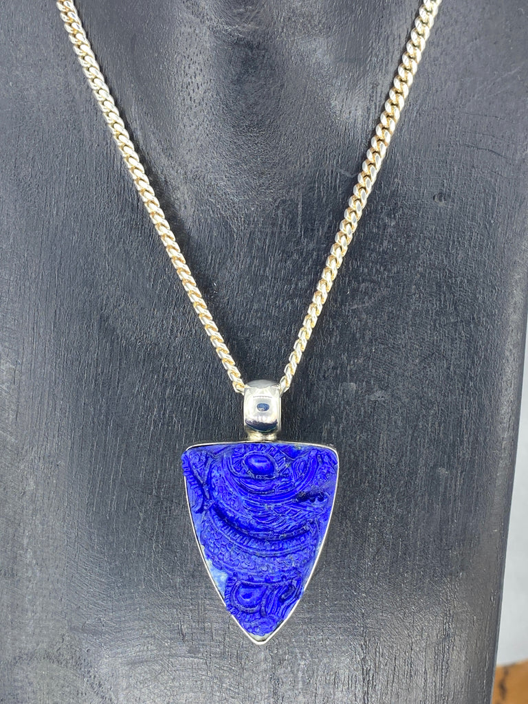 This amazing pendant has a dragon carved into the Lapis Lazuli & carefully set in 925 sterling silver.