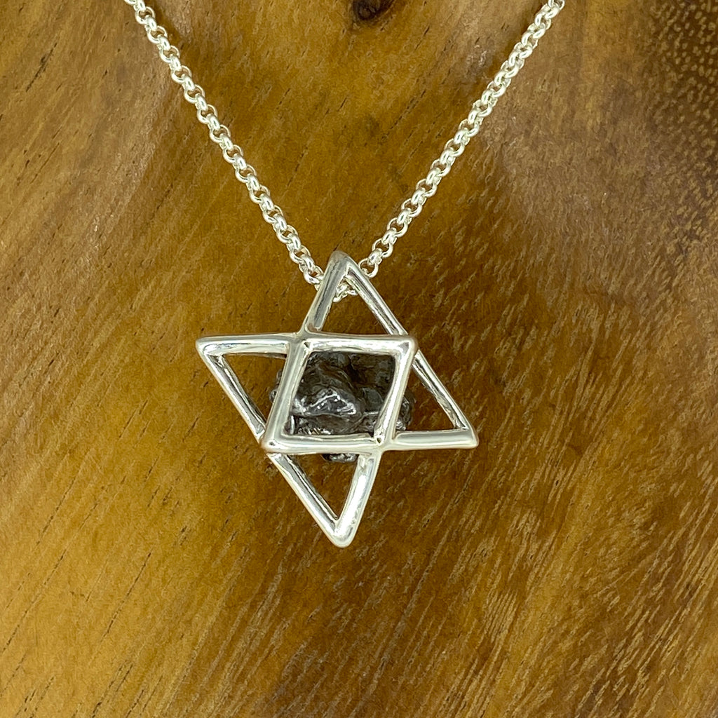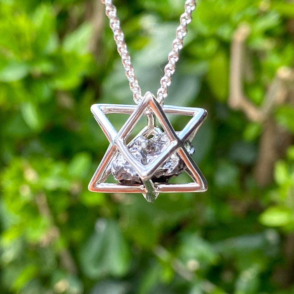 Wear a little piece of our solar system with this incredible necklace which has a raw piece of Camp del Cielo Meteorite inside a sterling silver Merkaba star. Silver chain is included and has 5 optional lengths to fasten from 45cm to 55cm.