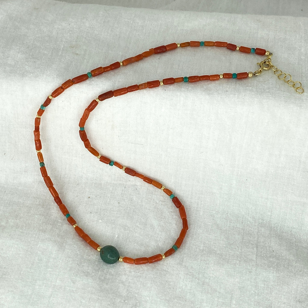 Stunning Red Coral necklace featuring Turquoise and 14K gold filled, Turquoise centre piece.