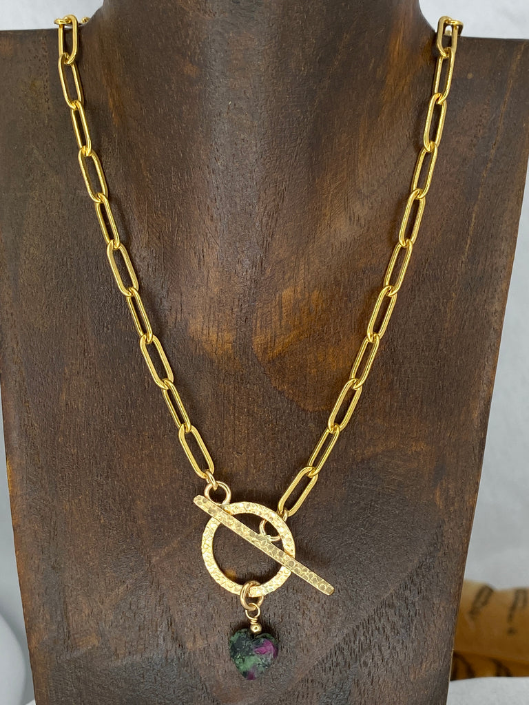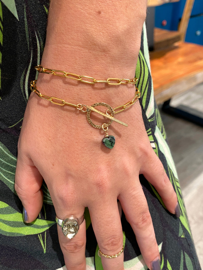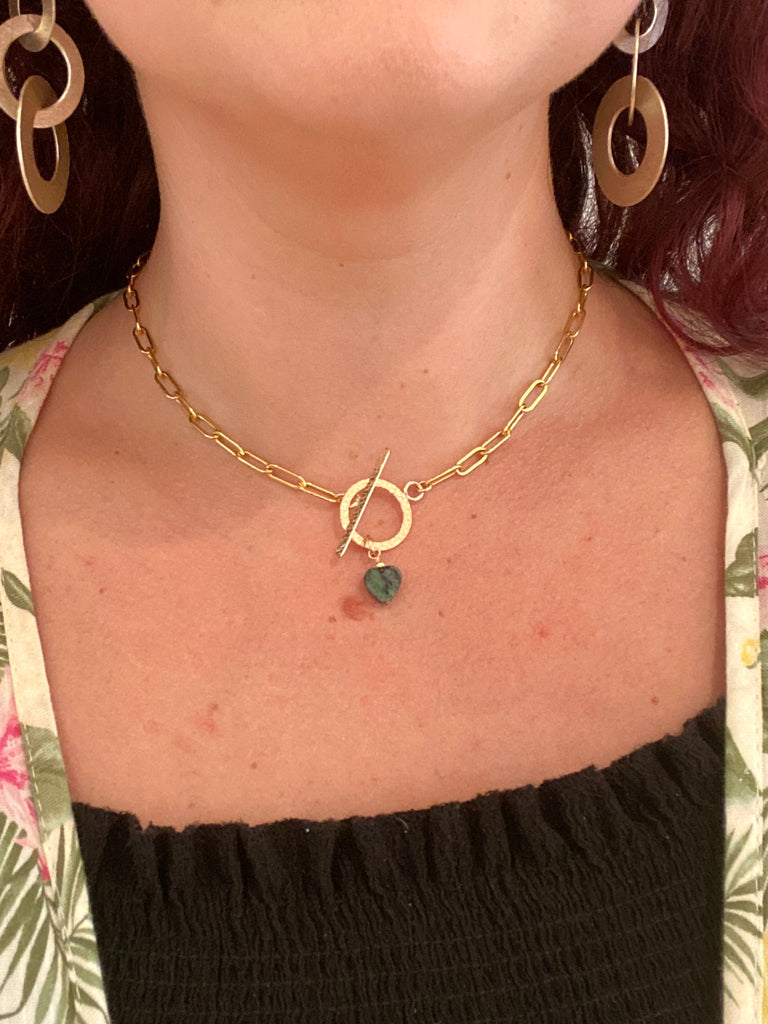 This necklace can be worn in 2 ways as a necklace with a toggle in the front and a Ruby Zoisite heart dangling or as a double wrap bracelet.