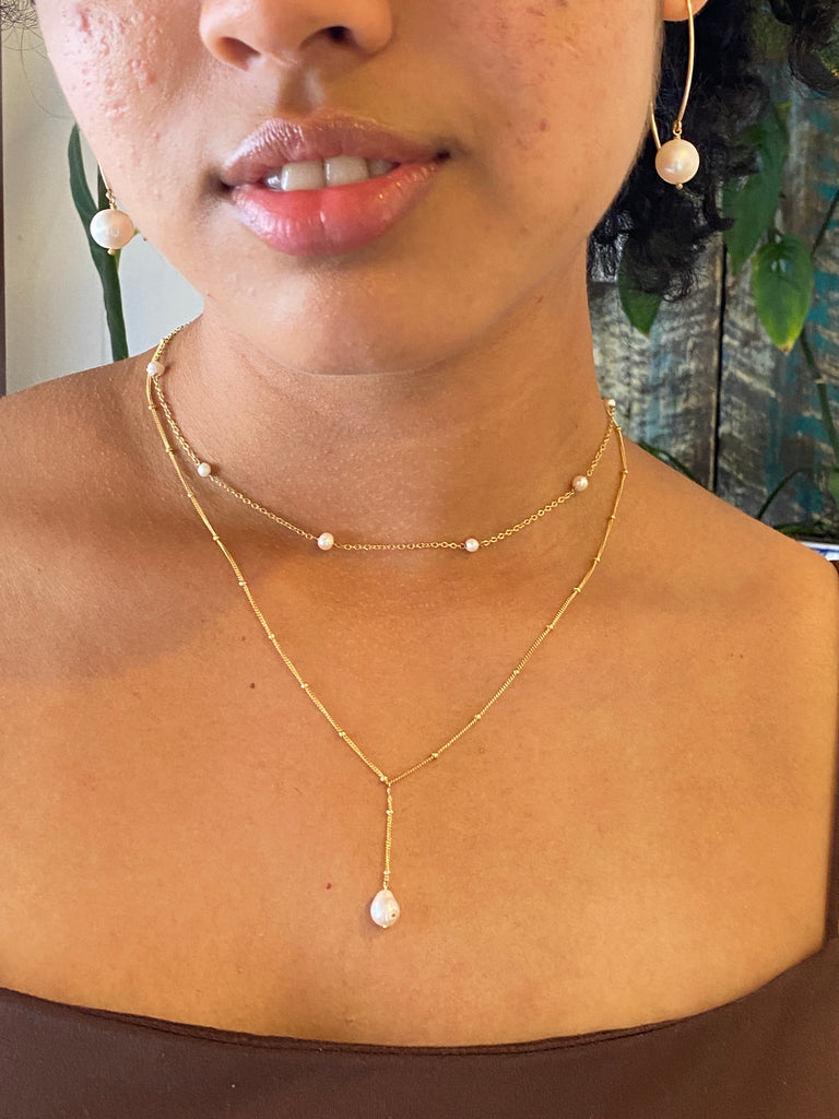 Versatile and elegant drop necklace to adorn yourself ready for an event, party or everyday wear. Hand-made using 14 K Gold Filled & a Freshwater Pearl hanging from a gold filled chain.