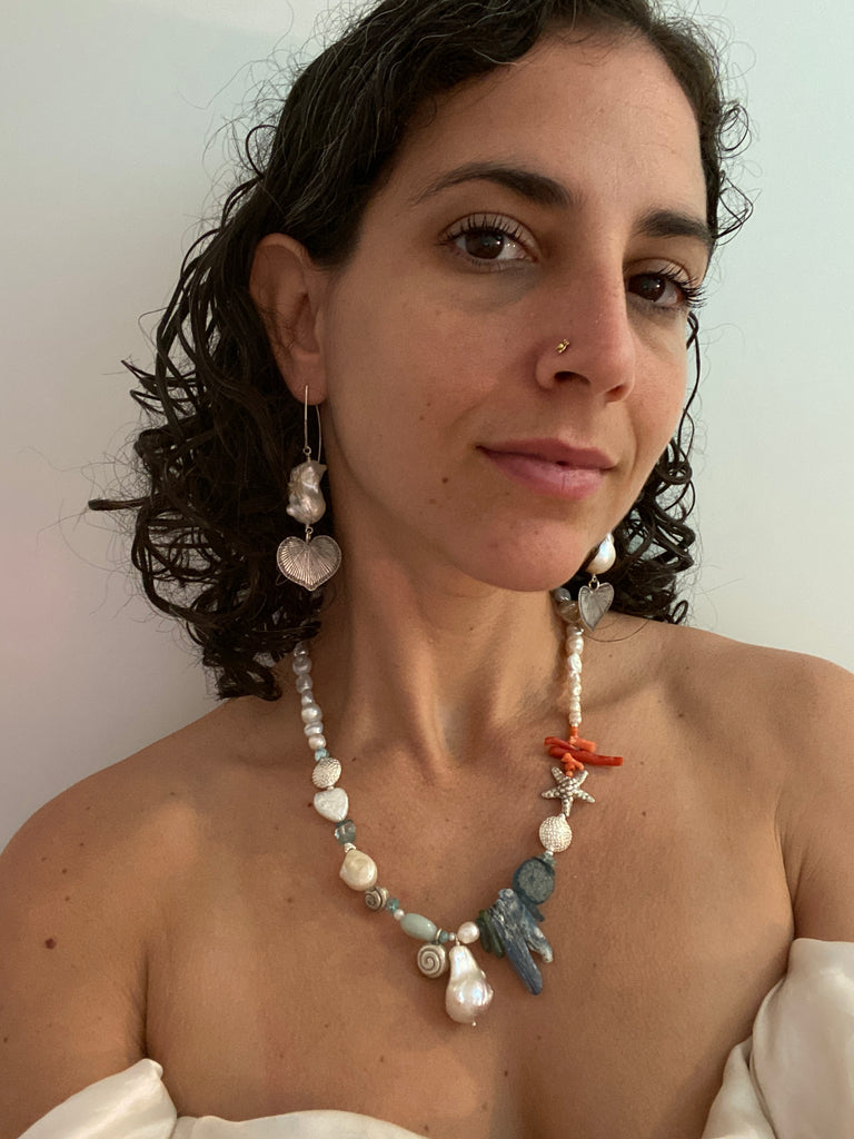 A total one of a kind, funky Ocean inspired necklace full of Freshwater Baroque Pearls, Sea glass, natural Red Coral, Larimar, Kyanite Aquamarine, Amazonite and Apatite.