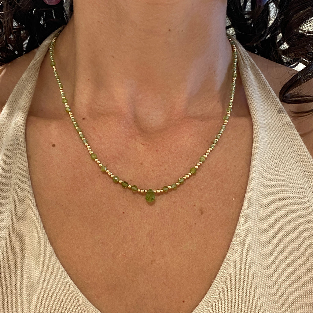 - Peridot droplet necklace with pops of 14K Gold filled beads